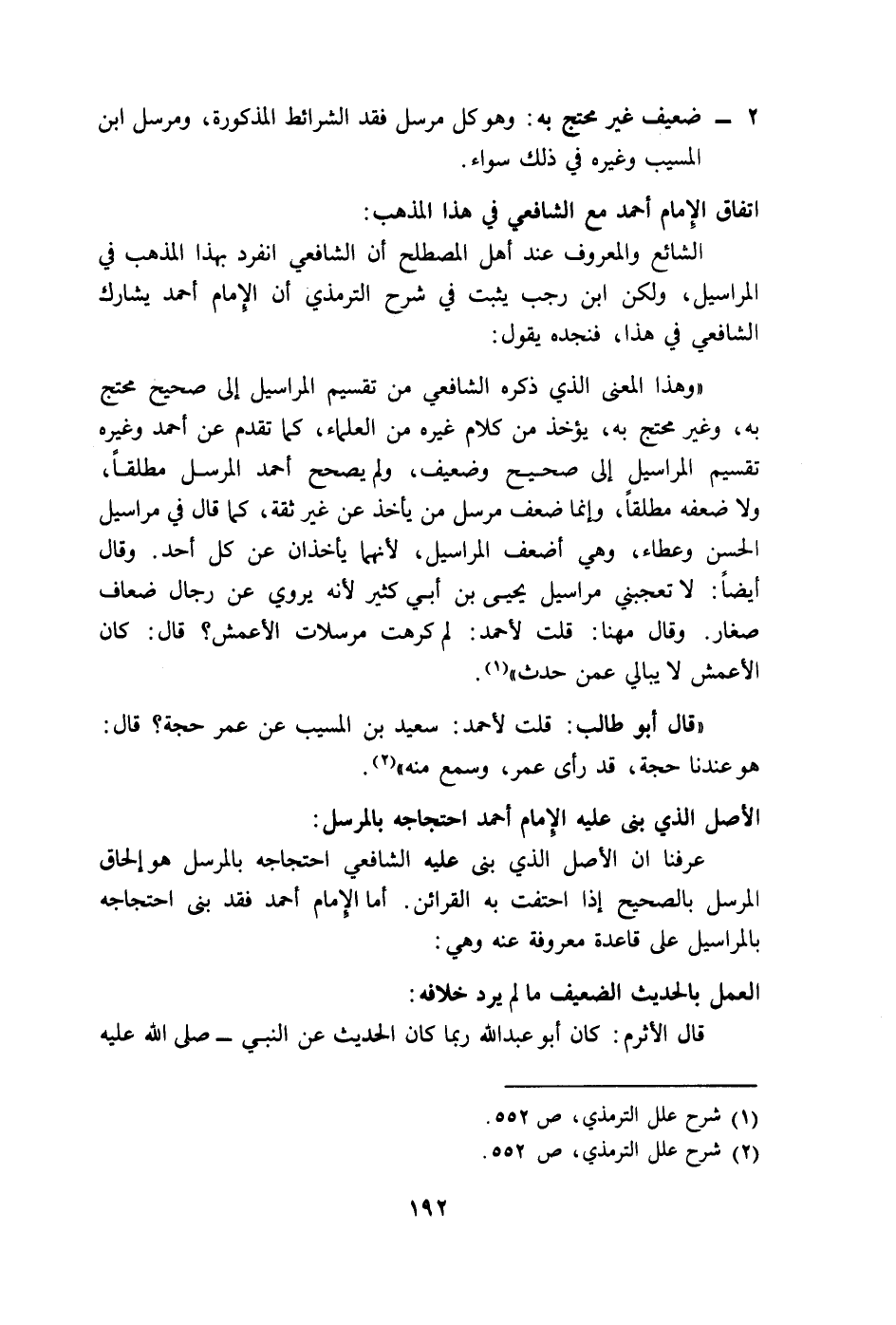 وكلام يحيى بن سعيد القطان الذي ذكره الترمذي يبين قدر التفاوت بين المرسلات قال ابن رجب وذكر الترمذي -أيضا- كلام يحيى بن سعيد القطان في أن بعض المرسلات أضعف من بعض ومضمون ما ذكره عنه تضعيف مرسلات عطاء وأبي إسحاق والأعمش والتيمي ويحيى بن أبي كثير والثوري وابن عيينة وأن مرسلات مجاهد وطاوس وسعيد بن المسيب ومالك أحب إليه منها