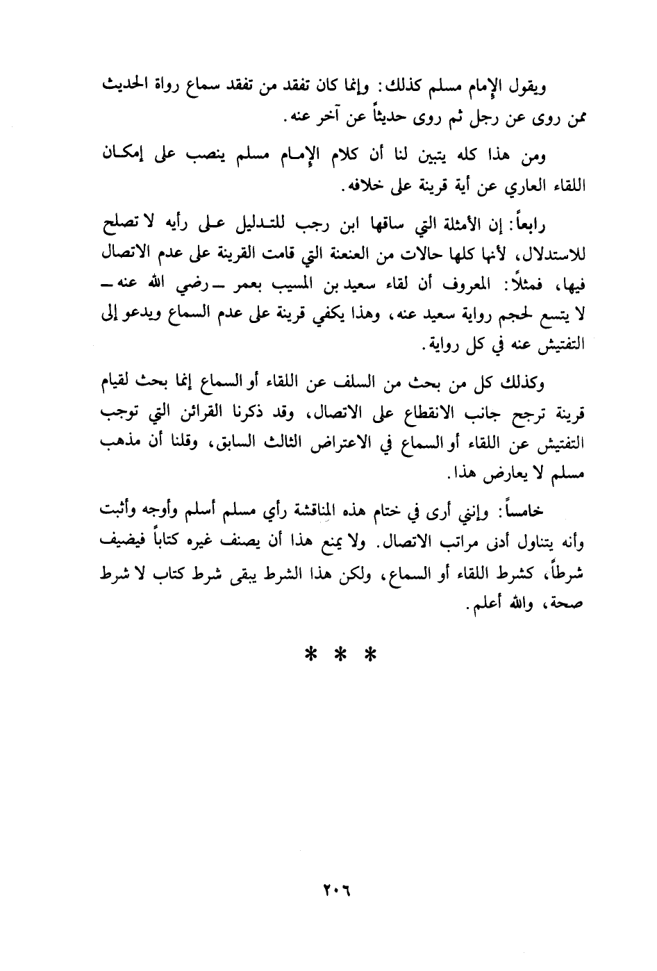 ويواصل ابن رجب عرض أقوال العلماء الذين فتشوا عن السماع ولم يكتفوا بمجرد المعاصرة أو حتى اللقى والرواية ويخلص من هذا العرض بقوله