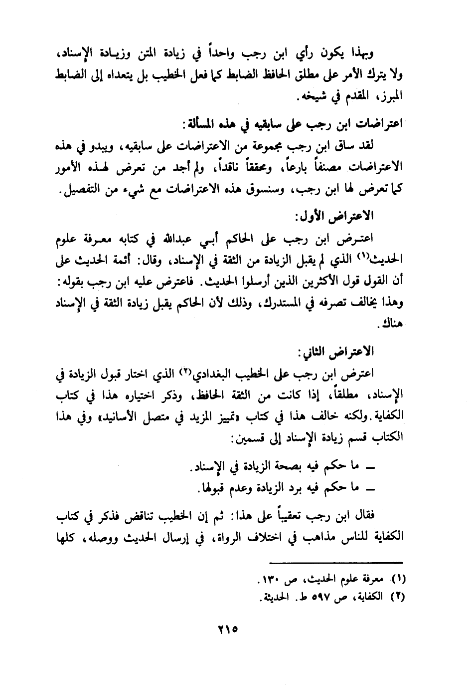 2- وإما لتعدد مخرج الحديثين ونحن في زيادة الثقة التي تتحد في المخرج مع الحديث الأصل وكل حديثين في الموضوع الواحد اختلفا في المخرج وفي أحدهما زيادة في الحكم فإنهما يخضعان للعموم والخصوص أو الإطلاق والتقييد وقد نبه ابن رجب على هذا الفارق بين زيادة الثقة وغيرها