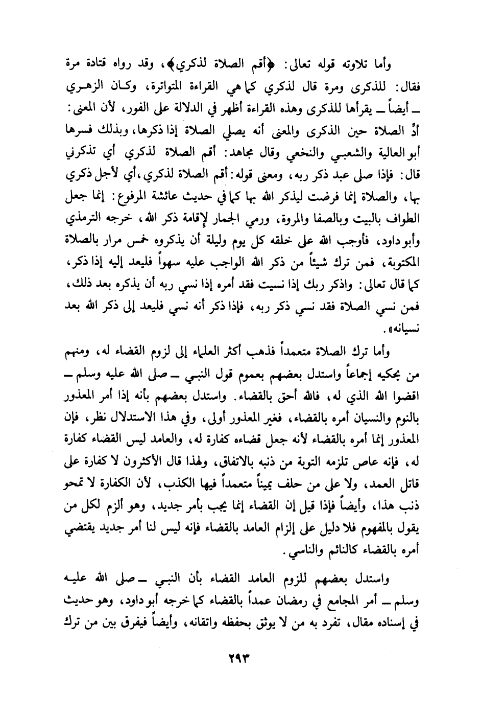 4- يتناول فقه الحديث ويفصل قضاياه ويذكر أقوال العلماء وأدلتهم ويناقش يرجح كل ذلك باستيعاب وإطالة غير مخلين فيجد الباحث نفسه وهو يستعرض هذه المسائل مستغرقا مع كتاب موسوعي في الفقه المقارن وفي النموذج الأول الذي ألحقناه بهذا المبحث مثال على هذا المنهج فقد تناول قضاء الصلاة الفائتة عمدا بما يزيد على ست لوحات مخطوطة ويمتاز منهجه هذا بالأدب الجم والحرص على نسبة كل قول إلى قائلة والإفاضة في ذكر أدلة كل قول وهو وإن كان يركز على المذهب الحنبلي إلا أنه قد يعدل عن هذا المذهب إلى غيره تبعا للدليل القوي