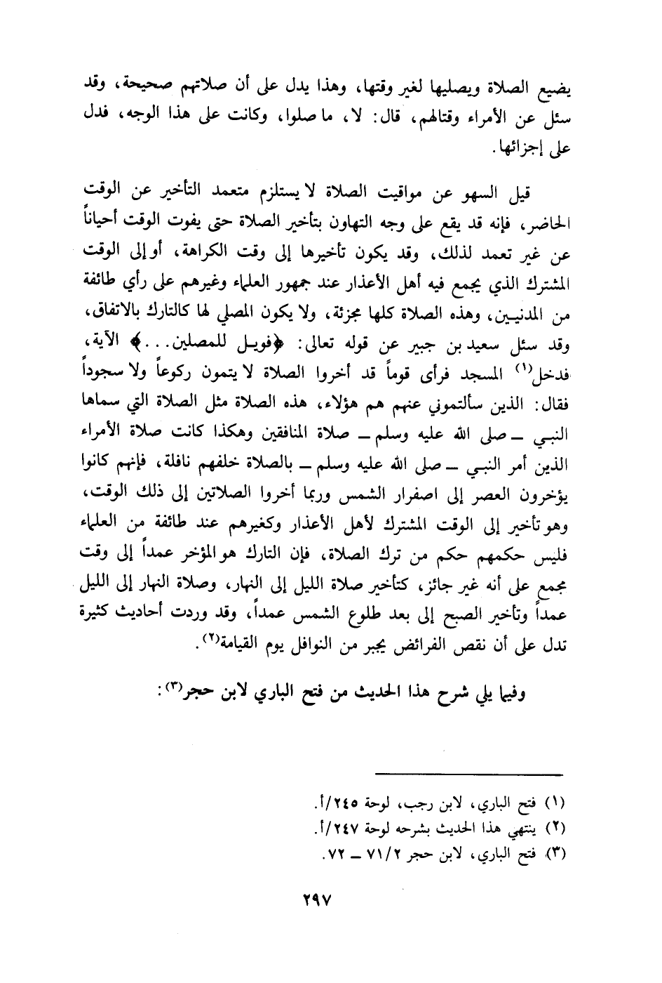 فائية في الذمة لا يكاد يقوم عليه دليل قوي والذي صح عن ابن عمر في ذلك إنما هو في صلاة واحدة فائتة ذكرت مع اتساع وقت الحاضرة لها فلا يلزم ذلك أن يكون حكم الصلوات إذا كثرت أو تأخر قضاؤها حتى صلى صلوات كثيرة في أوقاتها كذلك ولهذا فرق أكثر العلماء بين أن تكثر الفوائت أو تقل ولم ير مالك إلا إعادة الصلاة التي وقتها ولى خاصة فإن إيجاب إعادة صلوات سنين عديدة لأجل صلاة واحدة فيه عسر عظيم تأباه قواعد الحنيفية السمحة وقد أخبرني بعض أعيان العلماء أنه رأى النبي وسأله عما يقوله الشافعي وأحمد فيه هذه المسائل أيهما أرجح قال ففهمت منه أنه أشار إلى رجحان ما يقوله الشافعي -رحمه الله- ومما يدل على صحة ذلك حديث عمران بن حصين عن النبي أنه قال لا ينهاكم الله عن الربا ويقبله منكم فهذا يدل على أن من عليه صلاة واحدة لم يأمره الله بأن يصلي زيادة عليها