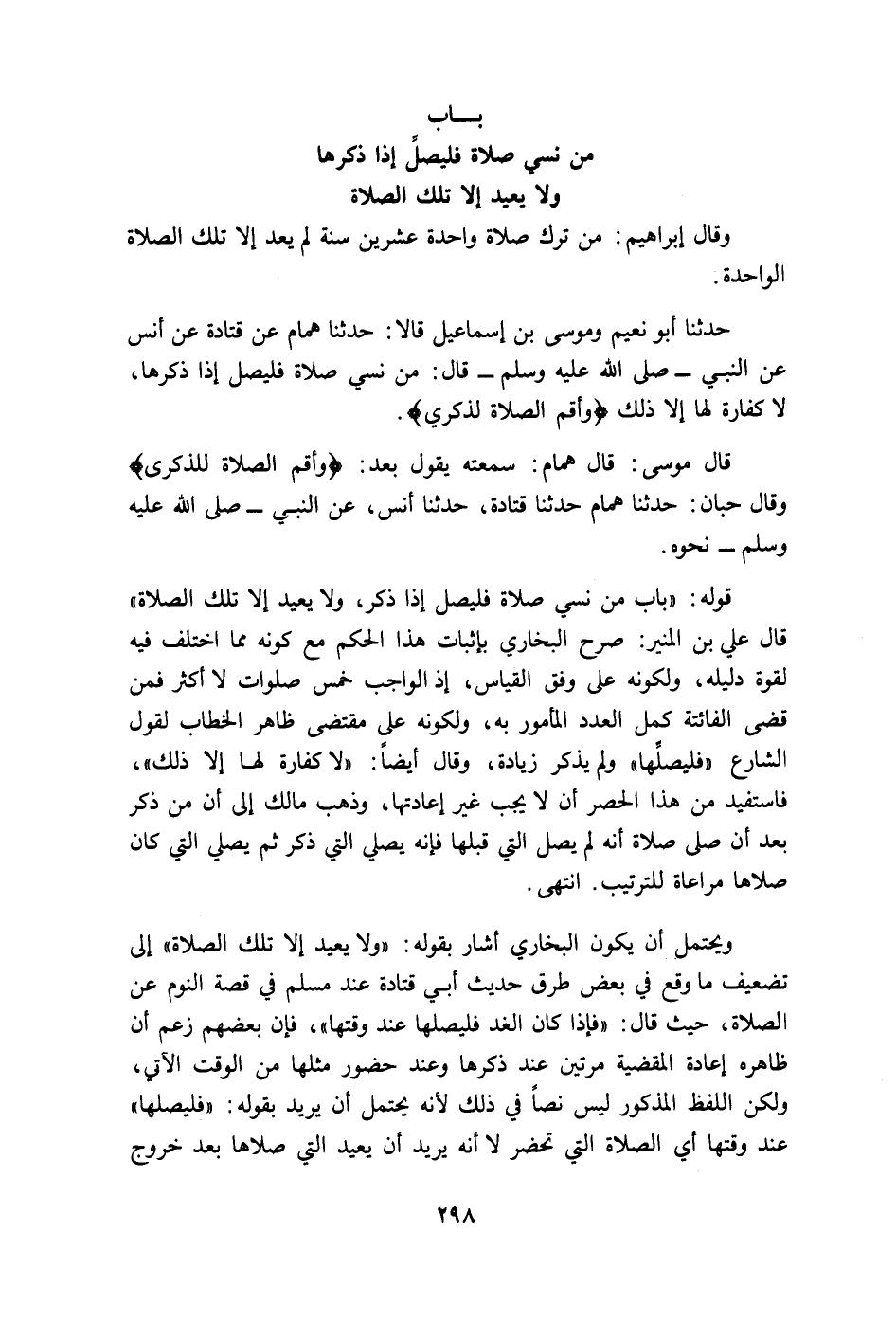 على وجوب القضاء على النائم إذا استيقظ والناسي إذا ذكر وقد حكى الإجماع على ذلك غير واحد وذكر ابن عبد البر أن محمد بن (رسم) روى عن محمد بن الحسن أن النائم إذا فاتته في نومه أكثر من خمس صلوات لا قضاء عليه إلحاقا للنوم الطويل إذا زاد على يوم وليلة بالإغماء والمغمى عليه لا قضاء عليه عنده ويكون الأمر عنده بالقضاء في النوم المعتاد وهو ما تفوت فيه الصلاة أو صلاتان أو دون خمس أو أكثر وأخذ الجمهور بعموم الحديث وقوله فليصل إذا ذكر استدل به من يقول بوجوب قضاء الصلوات على الفور وهو قول أبي حنيفة ومالك وأحمد يوجبه بكل حال قلت الصلوات أو كثرت واستدلوا أيضا بقوله لا كفارة لها إلا ذلك وذهب الشافعي إلى أن القضاء على التراخي كقضاء صيام رمضان وليس الصوم كالصلاة فإن الصيام لا يجوز تأخيره حتى يدخل نظيره من العام القابل والصلاة عندهم بخلاف ذلك واستدلوا أيضا بتأخير النبي الصلاة حتى خرج من الوادي وفيه نظر فإن ذاك تأخير يسير لمصلحة تتعلق بالصلاة وهو التباعد عن موضع تكره الصلاة فيه وقد روي عن سمرة بن جندب فيمن عليه صلوات فائتة أنه يصلي مع كل صلاة صلاة وقد روي عنه مرفوعا خرجه البزار بإسناده ضعيف ولأصحاب الشافعي فيما إذا كان الفوات بغير عذر في جوب القضاء على الفور وجهان وحمل الخطابي قوله لا كفارة لها إلا ذلك على وجهين