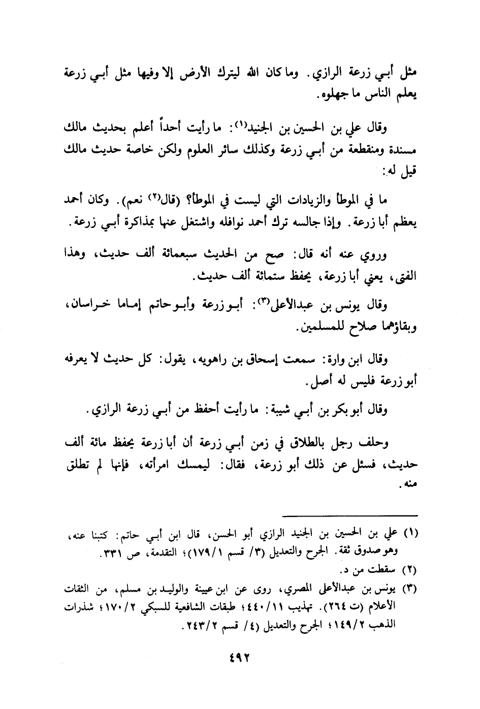 وقال ابن حبان : سمعت على بن أحمد الجرجاني بحلب يقول سمعت حنبل بن إسحاق يقول سمعت عمي أحمد بن حنبل يقول : (( أحفظنا للطوالات الشاذكوني ، وأعرفنا بالرجال يحيى بن معين ، واعلمنا بالعلل علي بن المديني ، وكأنه أومأ إلى نفسه أنه أفقههم )) .