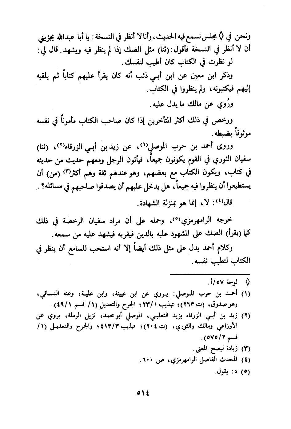 وقال إسحاق بن هانئ : (( كنت أقرأ على أبي عبد الله - يعني أحمد - الحديث وأنا أنظر في كتابه ، وهو ينظر معي ، فقال لي : هذا أحب إلىّ من أن أقرأ أنا عليك ، قلت له أقول : حدثني ؟ قال : قل إن شئت ، ولكن أحب إليّ أن تصدق أن تقول قرأت )) .