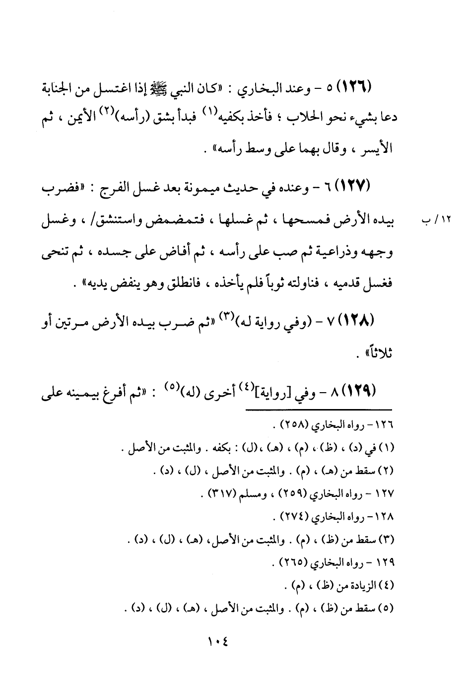 (126) وَعند البُخَارِيّ: " كَانَ النَّبِي [صَلَّى اللَّهُ عَلَيْهِ وَسَلَّم َ] إِذا اغْتسل من الْجَنَابَة دَعَا بِشَيْء نَحْو الحلاب؛ فَأخذ بكفيه فَبَدَأَ بشق (رَأسه) الْأَيْمن، ثمَّ الْأَيْسَر، وَقَالَ بهما عَلَى وسط رَأسه ".