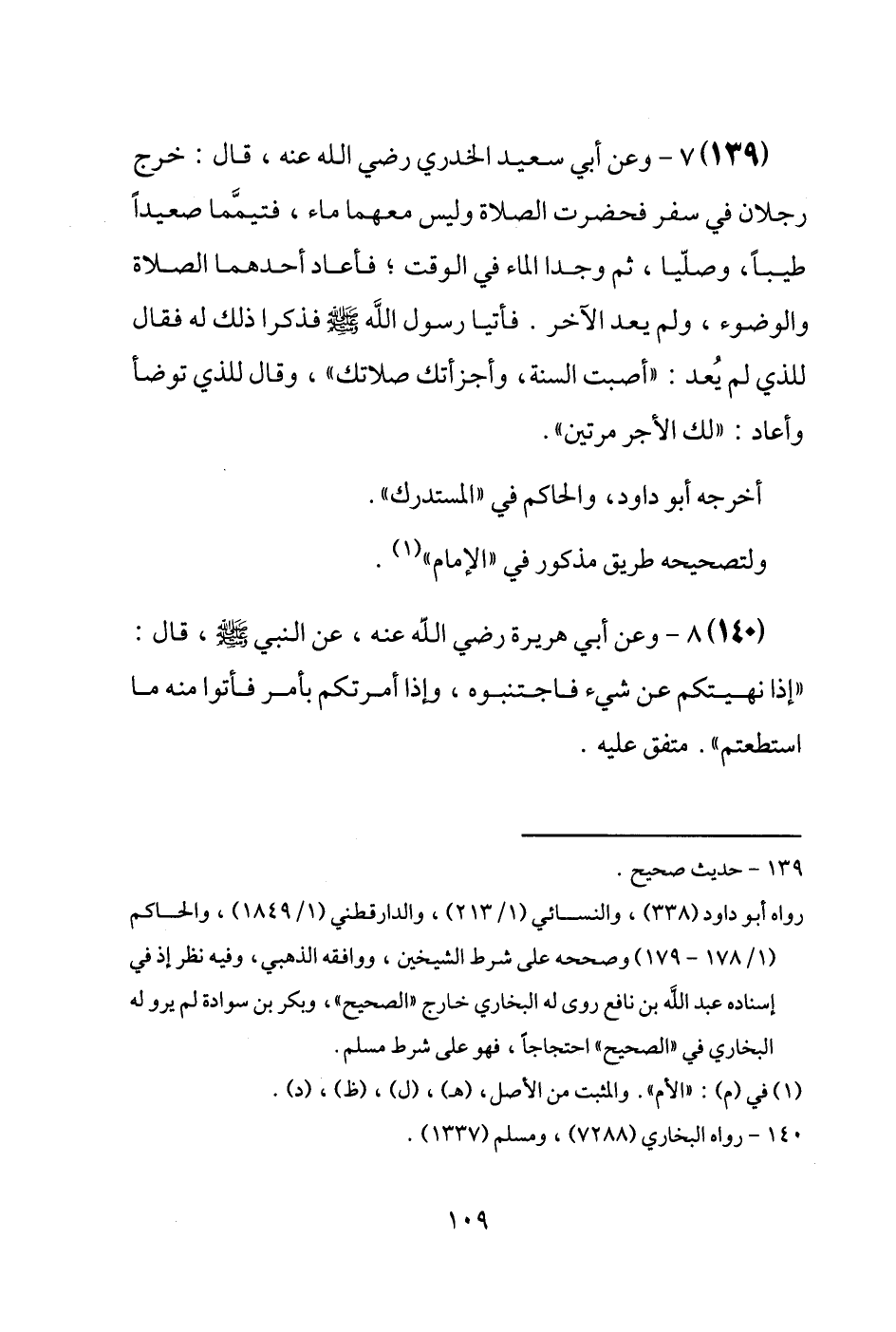 (139) وَعَن أبي سعيد الْخُدْرِيّ رَضِيَ اللَّهُ عَنْه، قَالَ: خرج رجلَانِ فِي سفر فَحَضَرت الصَّلَاة وَلَيْسَ مَعَهُمَا مَاء، فتيمَّما صَعِيدا طيبا، وصلّيا، ثمَّ وجدا المَاء فِي الْوَقْت؛ فَأَعَادَ أَحدهمَا الصَّلَاة وَالْوُضُوء، وَلم يعد الآخر. فَأتيَا رَسُول الله [صَلَّى اللَّهُ عَلَيْهِ وَسَلَّم َ] فذكرا ذَلِك لَهُ فَقَالَ للَّذي لم يُعد: " أصبت السّنة، وأجزأتك صَلَاتك "، وَقَالَ للَّذي تَوَضَّأ وَأعَاد: " لَك الْأجر مرَّتَيْنِ ". أخرجه أَبُو دَاوُد، وَالْحَاكِم فِي " الْمُسْتَدْرك ". ولتصحيحه طَرِيق مَذْكُور فِي " الإِمَام ".
