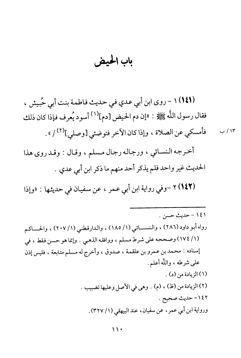 (141) رَوَى ابْن أبي عدي فِي حَدِيث فَاطِمَة بنت أبي حُبيش، فَقَالَ رَسُول الله [صَلَّى اللَّهُ عَلَيْهِ وَسَلَّم َ] : " إِن دم الْحيض [دم] أسود يُعرف فَإِذا كَانَ ذَلِك فأمسكي عَن الصَّلَاة، وَإِذا كَانَ الآخر فتوضئي [وَصلي] / ". أخرجه النَّسَائِيّ، وَرِجَاله رجال مُسلم، وَقَالَ: وَقد رَوَى هَذَا الحَدِيث غير وَاحِد فَلم يذكر أحد مِنْهُم مَا ذكر ابْن أبي عدي.