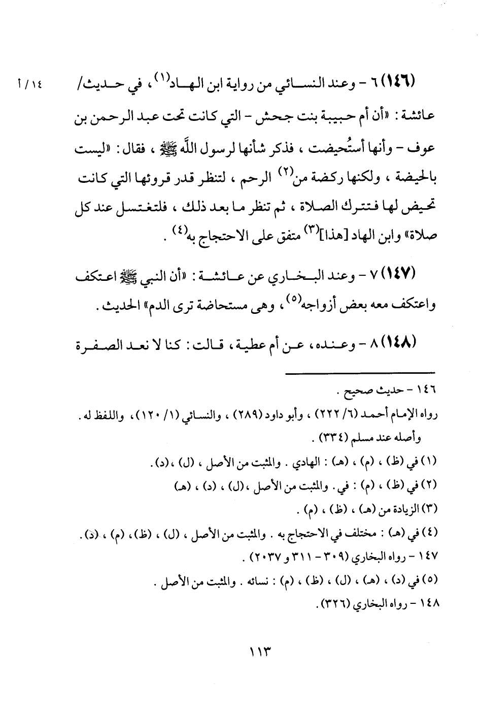 (147) وَعند البُخَارِيّ عَن عَائِشَة: " أَن النَّبِي [صَلَّى اللَّهُ عَلَيْهِ وَسَلَّم َ] اعْتكف وَاعْتَكف مَعَه بعض أَزوَاجه، وَهِي مُسْتَحَاضَة ترَى الدَّم " الحَدِيث.