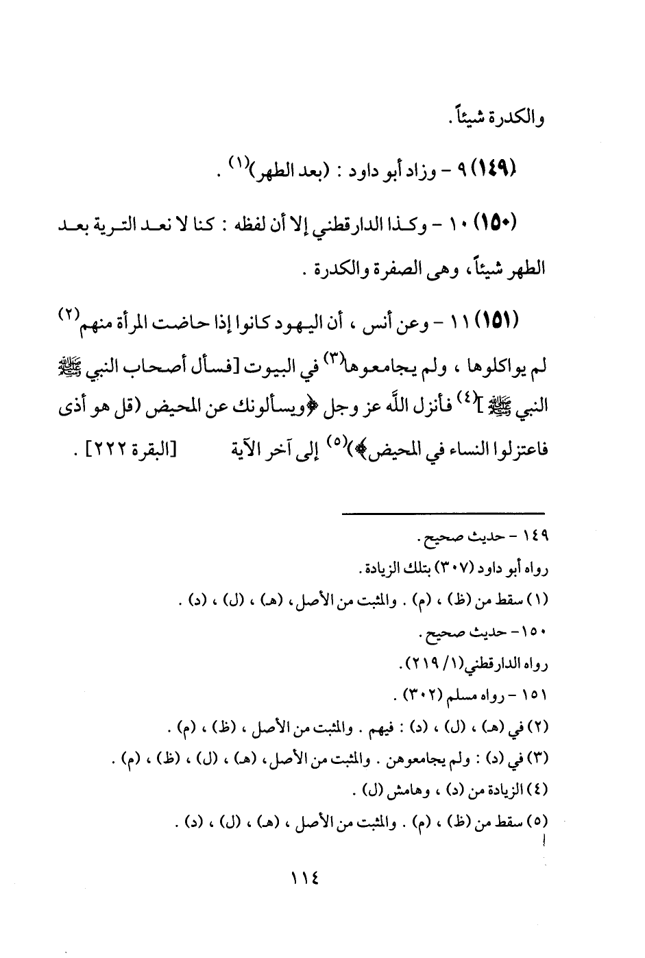 (151) وَعَن أنس، أَن الْيَهُود كَانُوا إِذا حَاضَت الْمَرْأَة مِنْهُم لم يواكلوها، وَلم يجامعوها فِي الْبيُوت [فَسَالَ أَصْحَاب النَّبِي [صَلَّى اللَّهُ عَلَيْهِ وَسَلَّم َ] النَّبِي [صَلَّى اللَّهُ عَلَيْهِ وَسَلَّم َ]] فَأنْزل الله عَزَّ وَجَلَّ {ويسألونك عَن الْمَحِيض قل هُوَ أَذَى فاعتزلوا النِّسَاء فِي الْمَحِيض} إِلَى آخر الْآيَة [الْبَقَرَة 222] .