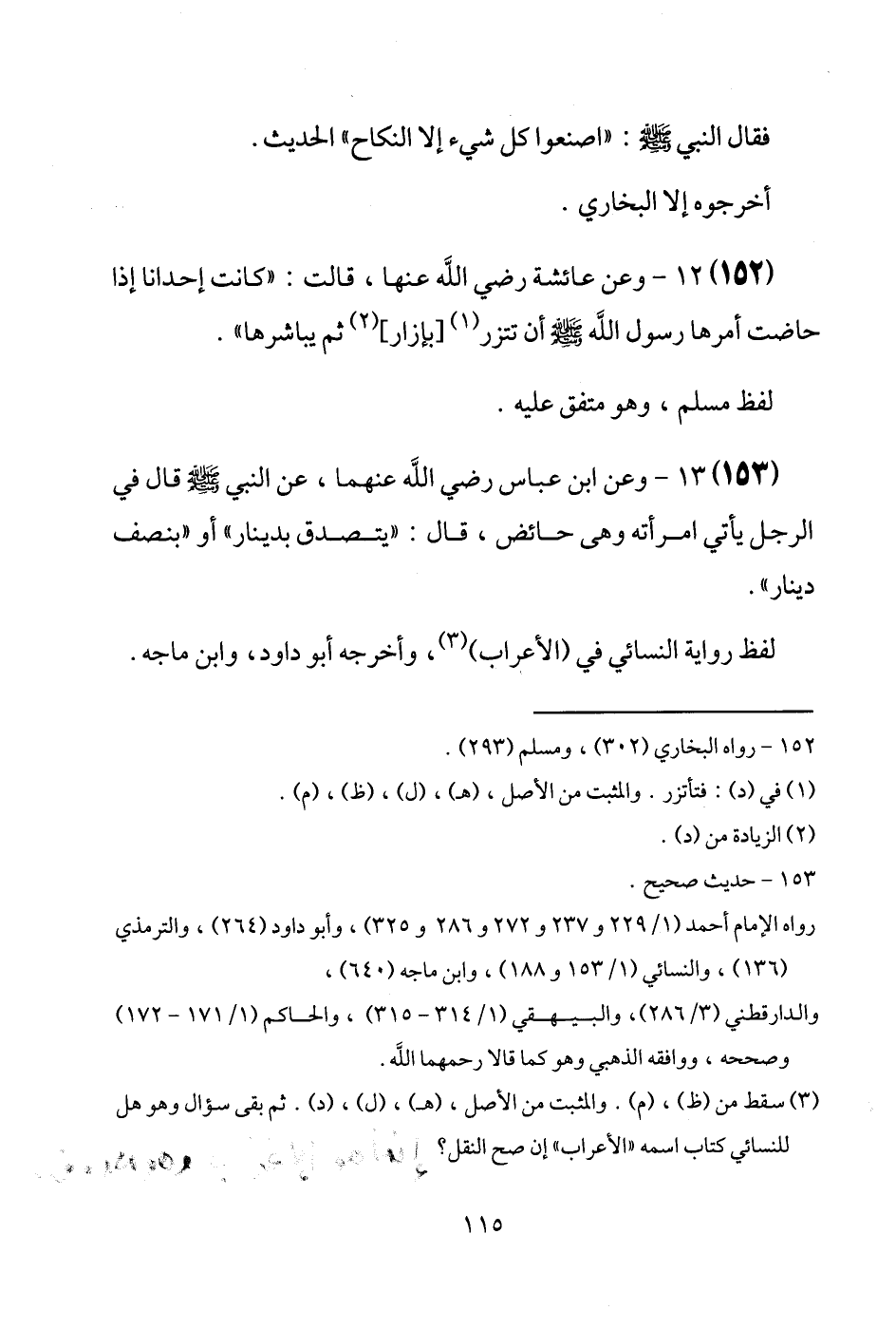 (152) وَعَن عَائِشَة رَضِيَ اللَّهُ عَنْها، قَالَت: " كَانَت إحدانا إِذا حَاضَت أمرهَا رَسُول الله [صَلَّى اللَّهُ عَلَيْهِ وَسَلَّم َ] أَن تتزر [يإزار] ثمَّ يُبَاشِرهَا ". لفظ مُسلم، وَهُوَ مُتَّفق عَلَيْهِ.