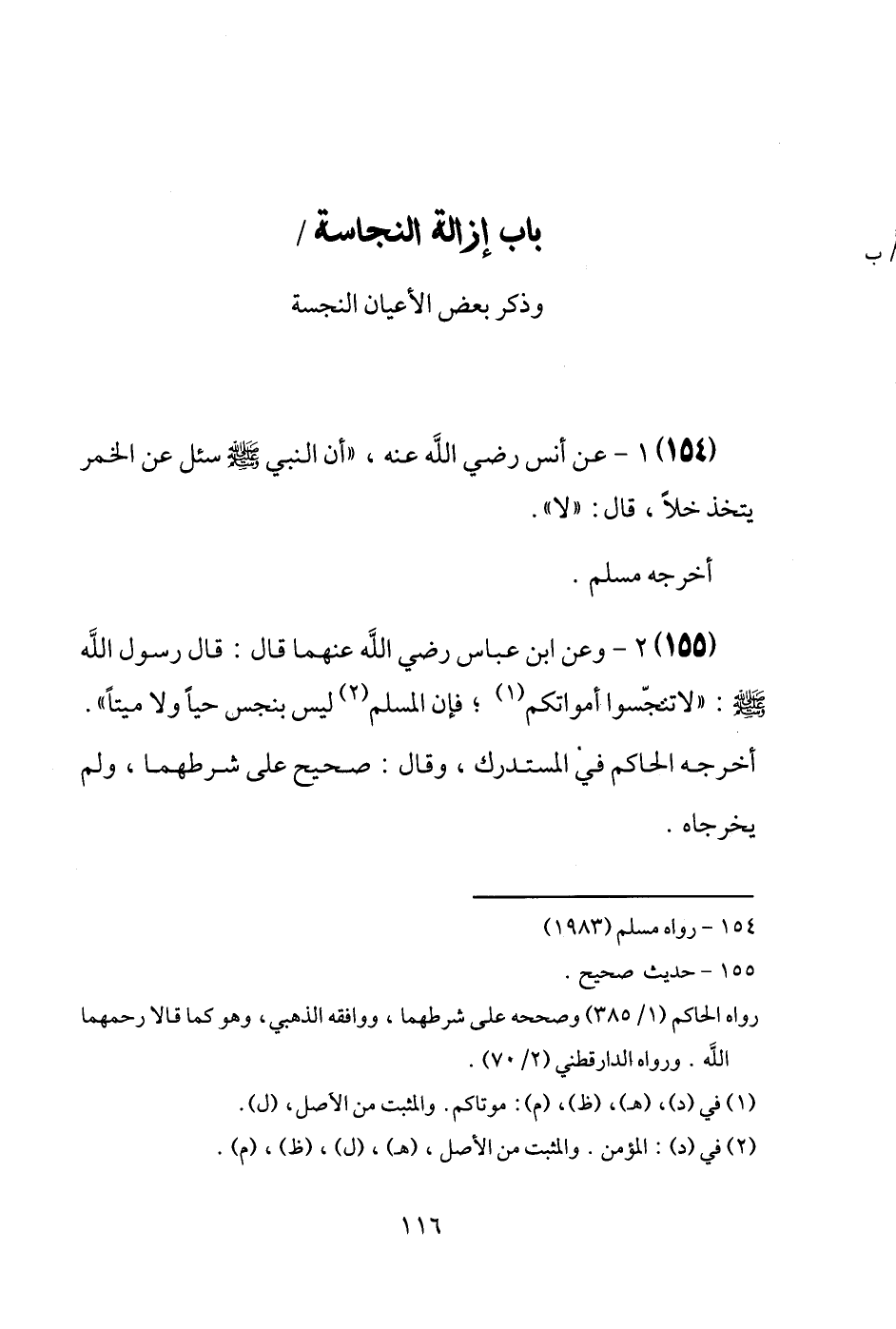 (155) وَعَن ابْن عَبَّاس رَضِيَ اللَّهُ عَنْهما قَالَ: قَالَ رَسُول الله [صَلَّى اللَّهُ عَلَيْهِ وَسَلَّم َ] : " لَا تنجّسوا أمواتكم؛ فَإِن الْمُسلم لَيْسَ بِنَجس حَيا وَلَا مَيتا ". أخرجه الْحَاكِم فِي الْمُسْتَدْرك، وَقَالَ: صَحِيح عَلَى شَرطهمَا، وَلم يخرجَاهُ.