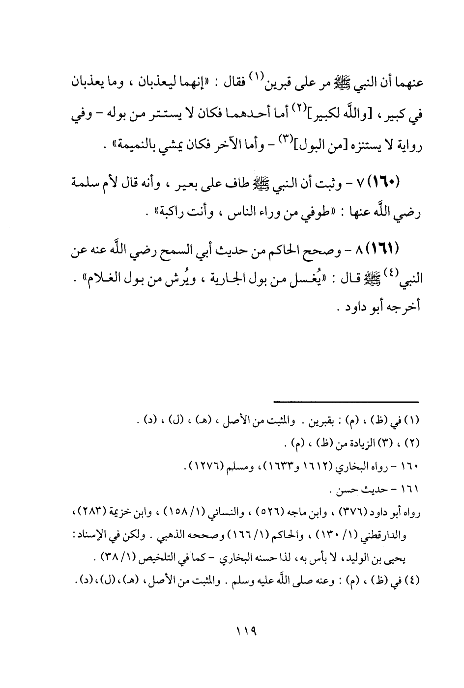 (161) وَصحح الْحَاكِم من حَدِيث أبي السَّمْح رَضِيَ اللَّهُ عَنْه عَن النَّبِي [صَلَّى اللَّهُ عَلَيْهِ وَسَلَّم َ] قَالَ: " يُغسل من بَوْل الْجَارِيَة، ويُرش من بَوْل الْغُلَام ". أخرجه أَبُو دَاوُد.