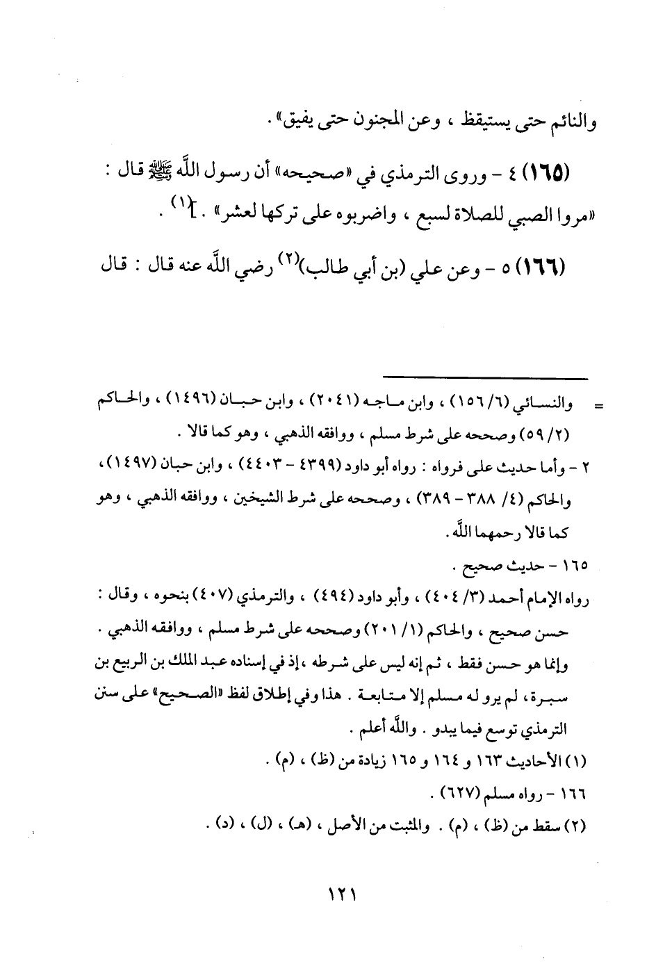 (165) وَرَوَى التِّرْمِذِيّ فِي " صَحِيحه " أَن رَسُول الله [صَلَّى اللَّهُ عَلَيْهِ وَسَلَّم َ] قَالَ: " مروا الصَّبِي للصَّلَاة لسبع، واضربوه عَلَى تَركهَا لعشر ".] .