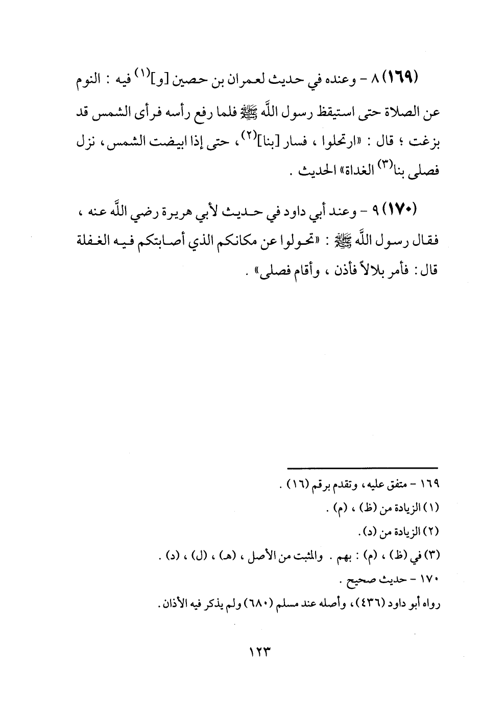(169) وَعِنْده فِي حَدِيث لعمران بن حُصَيْن [و] فِيهِ: النّوم عَن الصَّلَاة حَتَّى اسْتَيْقَظَ رَسُول الله [صَلَّى اللَّهُ عَلَيْهِ وَسَلَّم َ] فَلَمَّا رفع رَأسه فَرَأَى الشَّمْس قد بزغت؛ قَالَ: " ارتحلوا، فَسَار [بِنَا] ، حَتَّى إِذا ابْيَضَّتْ الشَّمْس، نزل فَصَلى بِنَا الْغَدَاة " الحَدِيث.