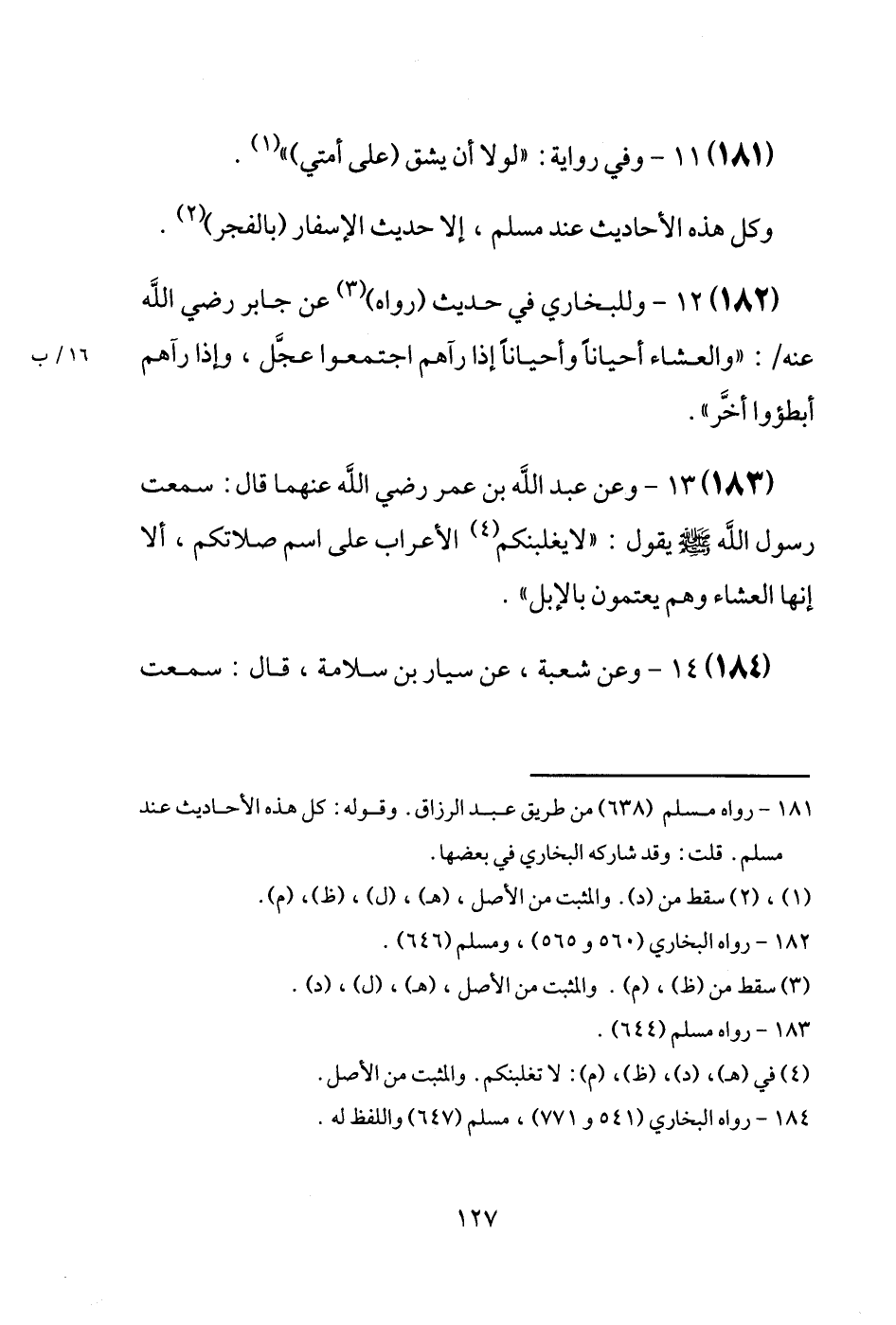 (183) وَعَن عبد الله بن عمر رَضِيَ اللَّهُ عَنْهما قَالَ: سَمِعت رَسُول الله [صَلَّى اللَّهُ عَلَيْهِ وَسَلَّم َ] يَقُول: " لَا يغلبنكم الْأَعْرَاب عَلَى اسْم صَلَاتكُمْ، أَلا إِنَّهَا الْعشَاء وهم يعتمون بِالْإِبِلِ ".