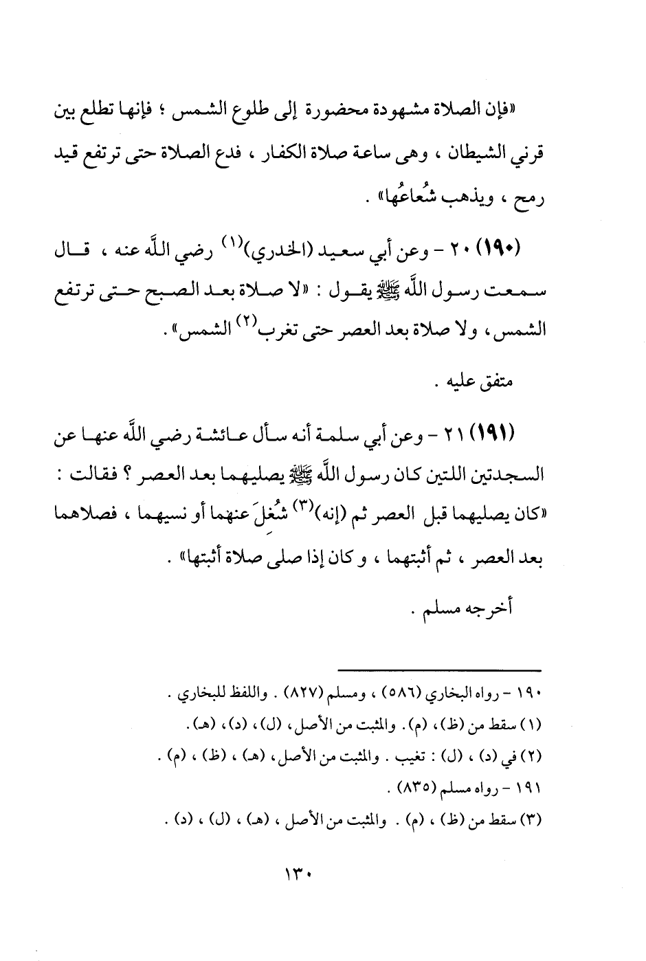 (190) وَعَن أبي سعيد (الْخُدْرِيّ) رَضِيَ اللَّهُ عَنْه، قَالَ سَمِعت رَسُول الله [صَلَّى اللَّهُ عَلَيْهِ وَسَلَّم َ] يَقُول: " لَا صَلَاة بعد الصُّبْح حَتَّى ترْتَفع الشَّمْس، وَلَا صَلَاة بعد الْعَصْر حَتَّى تغرب الشَّمْس ". مُتَّفق عَلَيْهِ.