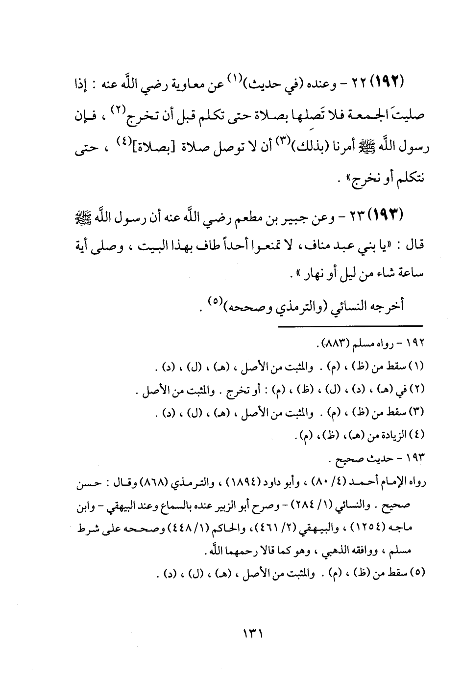(193) وَعَن جُبَير بن مطعم رَضِيَ اللَّهُ عَنْه أَن رَسُول الله [صَلَّى اللَّهُ عَلَيْهِ وَسَلَّم َ] قَالَ: " يَا بني عبد منَاف، لَا تمنعوا أحدا طَاف بِهَذَا الْبَيْت، وَصَلى أَيَّة سَاعَة شَاءَ من ليل أَو نَهَار ". أخرجه النَّسَائِيّ (وَالتِّرْمِذِيّ وَصَححهُ) .