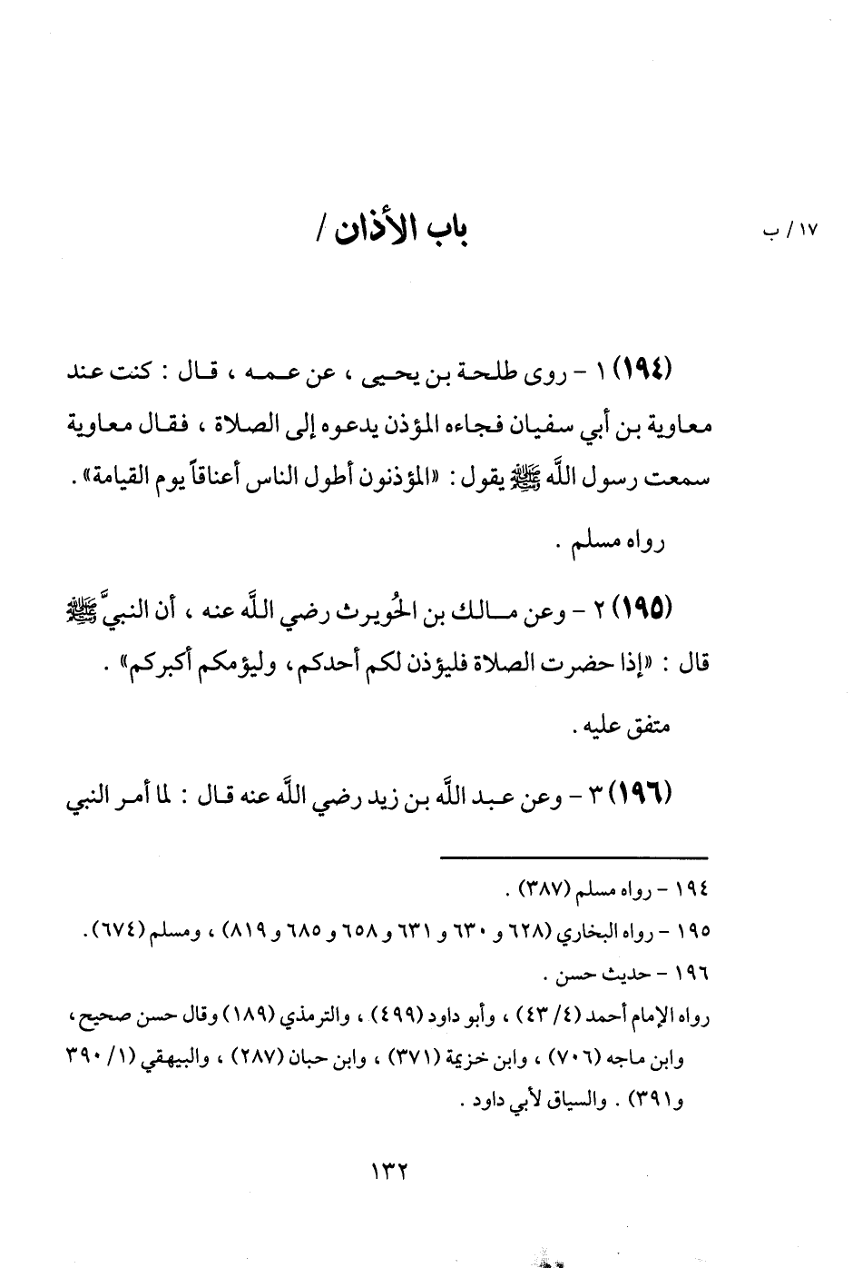 (194) رَوَى طَلْحَة بن يَحْيَى، عَن عَمه، قَالَ: كنت عِنْد مُعَاوِيَة بن أبي سُفْيَان فَجَاءَهُ الْمُؤَذّن يَدعُوهُ إِلَى الصَّلَاة، فَقَالَ مُعَاوِيَة سَمِعت رَسُول الله [صَلَّى اللَّهُ عَلَيْهِ وَسَلَّم َ] يَقُول: " المؤذنون أطول النَّاس أعناقاً يَوْم الْقِيَامَة ". رَوَاهُ مُسلم.