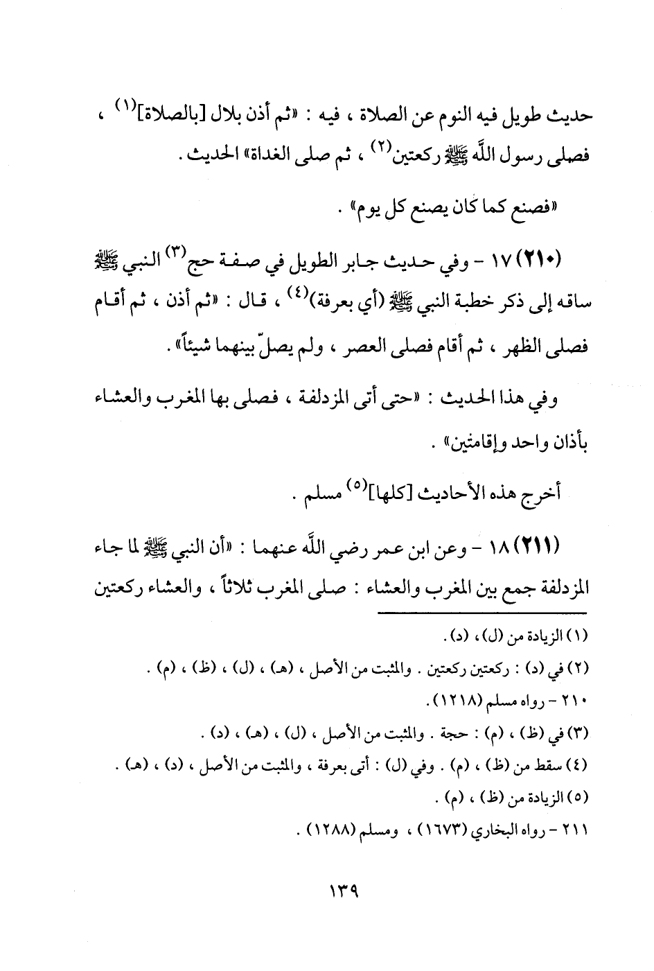 (210) وَفِي حَدِيث جَابر الطَّوِيل فِي صفة حج النَّبِي [صَلَّى اللَّهُ عَلَيْهِ وَسَلَّم َ] سَاقه إِلَى ذكر خطْبَة النَّبِي [صَلَّى اللَّهُ عَلَيْهِ وَسَلَّم َ] (أَي بِعَرَفَة) ، قَالَ: " ثمَّ أذن، ثمَّ أَقَامَ فَصَلى الظّهْر، ثمَّ أَقَامَ فَصَلى الْعَصْر، وَلم يصلّ بَينهمَا شَيْئا ". وَفِي هَذَا الحَدِيث: " حَتَّى أَتَى الْمزْدَلِفَة، فَصَلى بهَا الْمغرب وَالْعشَاء بِأَذَان وَاحِد وَإِقَامَتَيْنِ ". أخرج هَذِه الْأَحَادِيث [كلهَا] مُسلم.