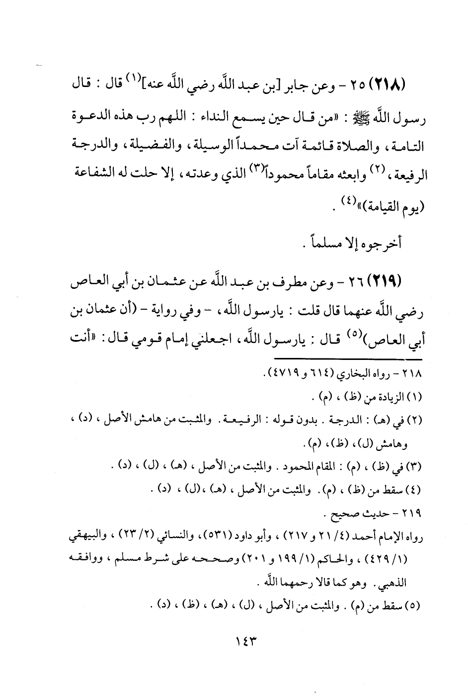 (219) وَعَن مطرف بن عبد الله عَن عُثْمَان بن أبي الْعَاصِ رَضِيَ اللَّهُ عَنْهما قَالَ قلت: يَا رَسُول الله، - وَفِي رِوَايَة - (أَن عُثْمَان بن أبي الْعَاصِ) قَالَ: يَا رَسُول الله، اجْعَلنِي إِمَام قومِي قَالَ: " أَنْت