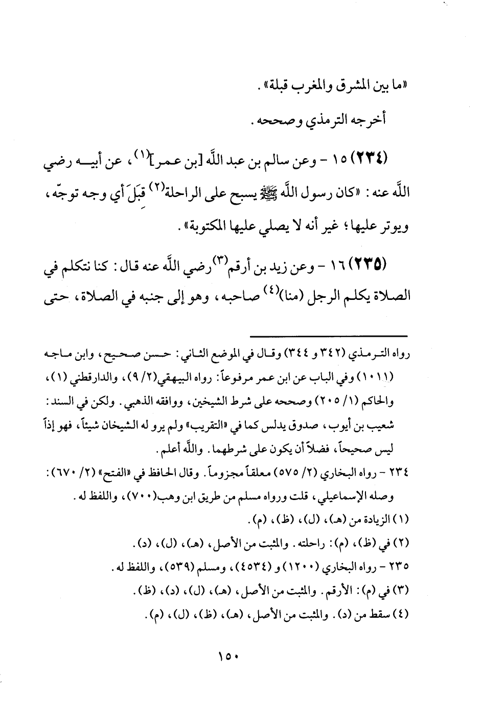 (235) وَعَن زيد بن أَرقم رَضِيَ اللَّهُ عَنْه قَالَ: كُنَّا نتكلم فِي الصَّلَاة يكلم الرجل (منا) صَاحبه، وَهُوَ إِلَى جنبه فِي الصَّلَاة، حَتَّى