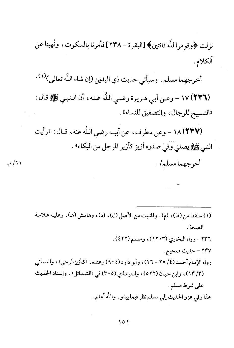 (237) وَعَن مطرف، عَن أَبِيه رَضِيَ اللَّهُ عَنْه، قَالَ: " رَأَيْت النَّبِي [صَلَّى اللَّهُ عَلَيْهِ وَسَلَّم َ] يُصَلِّي وَفِي صَدره أزيز كأزيز الْمرجل من الْبكاء ". أخرجهُمَا مُسلم /.