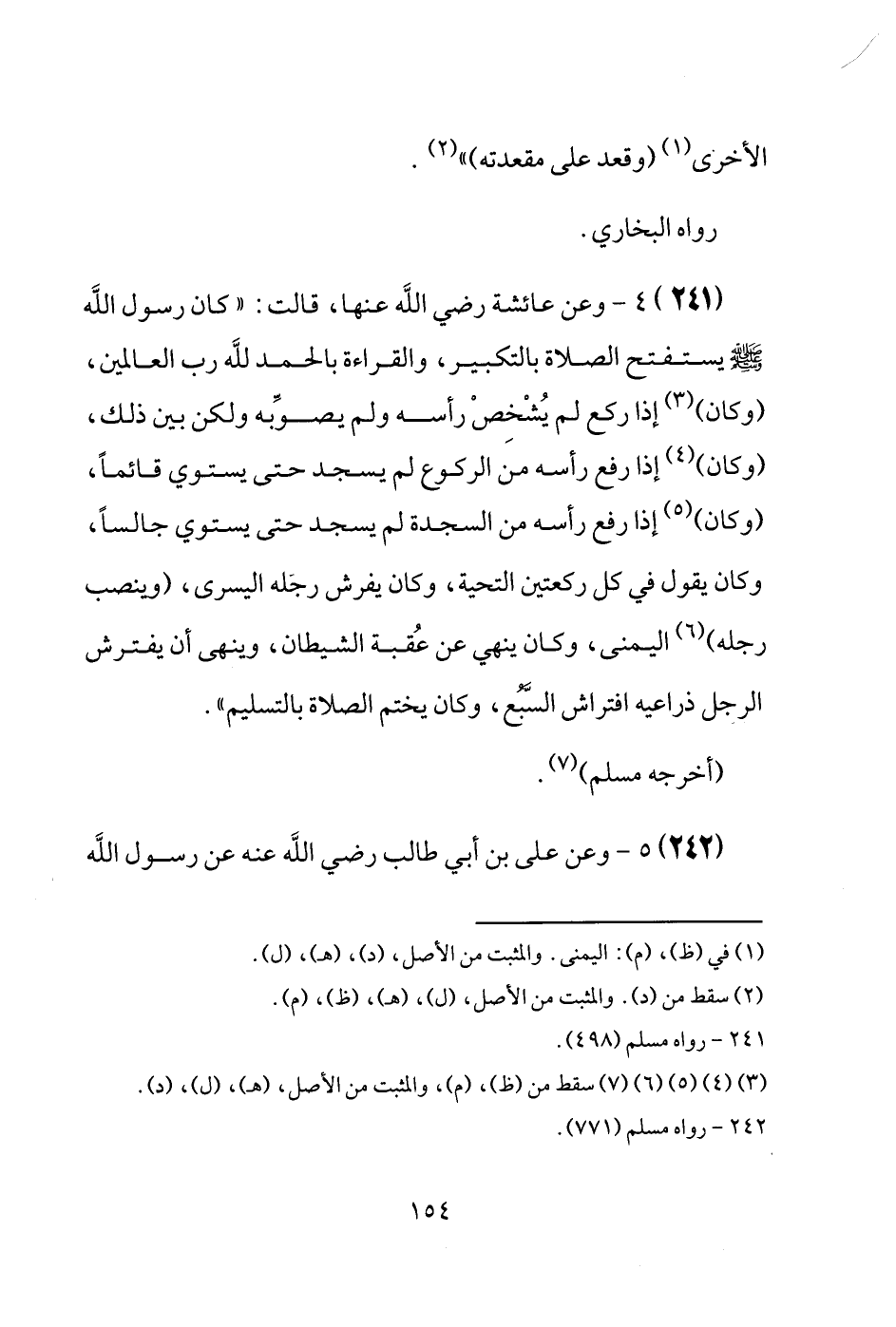 (241) وَعَن عَائِشَة رَضِيَ اللَّهُ عَنْها، قَالَت: " كَانَ رَسُول الله [صَلَّى اللَّهُ عَلَيْهِ وَسَلَّم َ] يستفتح الصَّلَاة بِالتَّكْبِيرِ، وَالْقِرَاءَة بِالْحَمْد لله رب الْعَالمين، (وَكَانَ) إِذا ركع لم يُشْخِصْ رَأسه وَلم يصوِّبه وَلَكِن بَين ذَلِك، (وَكَانَ) إِذا رفع رَأسه من الرُّكُوع لم يسْجد حَتَّى يَسْتَوِي قَائِما، (وَكَانَ) إِذا رفع رَأسه من السَّجْدَة لم يسْجد حَتَّى يَسْتَوِي جَالِسا، وَكَانَ يَقُول فِي كل رَكْعَتَيْنِ التَّحِيَّة، وَكَانَ يفرش رجله الْيُسْرَى، (وَينصب رجله) الْيُمْنَى، وَكَانَ ينْهَى عَن عُقبة الشَّيْطَان، وَينْهَى أَن يفترش الرجل ذِرَاعَيْهِ افتراش السَّبُع، وَكَانَ يخْتم الصَّلَاة بِالتَّسْلِيمِ ". (أخرجه مُسلم) .