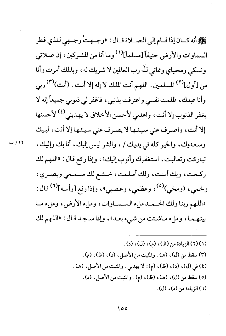 [صَلَّى اللَّهُ عَلَيْهِ وَسَلَّم َ] أَنه كَانَ إِذا قَامَ إِلَى الصَّلَاة قَالَ: " وجهتُ وَجْهي للَّذي فطر السَّمَاوَات وَالْأَرْض حَنِيفا [مُسلما] وَمَا أَنا من الْمُشْركين، إِن صَلَاتي ونسكي ومحياي ومماتي لله رب الْعَالمين لَا شريك لَهُ، وَبِذَلِك أمرت وَأَنا من [أول] الْمُسلمين. اللَّهُمَّ أَنْت الْملك لَا إِلَه إِلَّا أَنْت. (أَنْت) رَبِّي وَأَنا عَبدك، ظلمت نَفسِي وَاعْتَرَفت بذنبي، فَاغْفِر لي ذُنُوبِي جَمِيعًا إِنَّه لَا يغْفر الذُّنُوب إِلَّا أَنْت، واهدني لأحسن الْأَخْلَاق لَا يهديني لأحسنها إِلَّا أَنْت، واصرف عني سيئها لَا يصرف عني سيئها إِلَّا أَنْت، لبيْك وَسَعْديك، وَالْخَيْر كُله فِي يَديك /، وَالشَّر لَيْسَ إِلَيْك، أَنا بك وَإِلَيْك، تَبَارَكت وَتَعَالَيْت، أستغفرك وَأَتُوب إِلَيْك "، وَإِذا ركع قَالَ: " اللَّهُمَّ لَك ركعت، وَبِك آمَنت، وَلَك أسلمت، خشع لَك سَمْعِي وبصري، ولحمي، (ومخي) ، وعظمي، وعصبي "، وَإِذا رفع [رَأسه] قَالَ: " اللَّهُمَّ رَبنَا وَلَك الْحَمد ملْء السَّمَاوَات، وملء الأَرْض، وملء مَا بَينهمَا، وملء مَا شِئْت من شَيْء بعد "، وَإِذا سجد قَالَ: " اللَّهُمَّ لَك