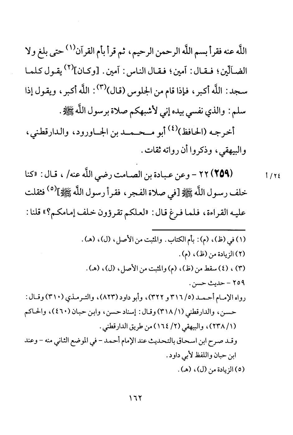 (259) وَعَن عبَادَة بن الصَّامِت رَضِيَ اللَّهُ عَنْه /، قَالَ: " كُنَّا خلف رَسُول الله [صَلَّى اللَّهُ عَلَيْهِ وَسَلَّم َ] [فِي صَلَاة الْفجْر، فَقَرَأَ رَسُول الله [صَلَّى اللَّهُ عَلَيْهِ وَسَلَّم َ]] فَثقلَتْ عَلَيْهِ الْقِرَاءَة، فَلَمَّا فرغ قَالَ: " لَعَلَّكُمْ تقرؤون خلف إمامكم؟ " قُلْنَا: