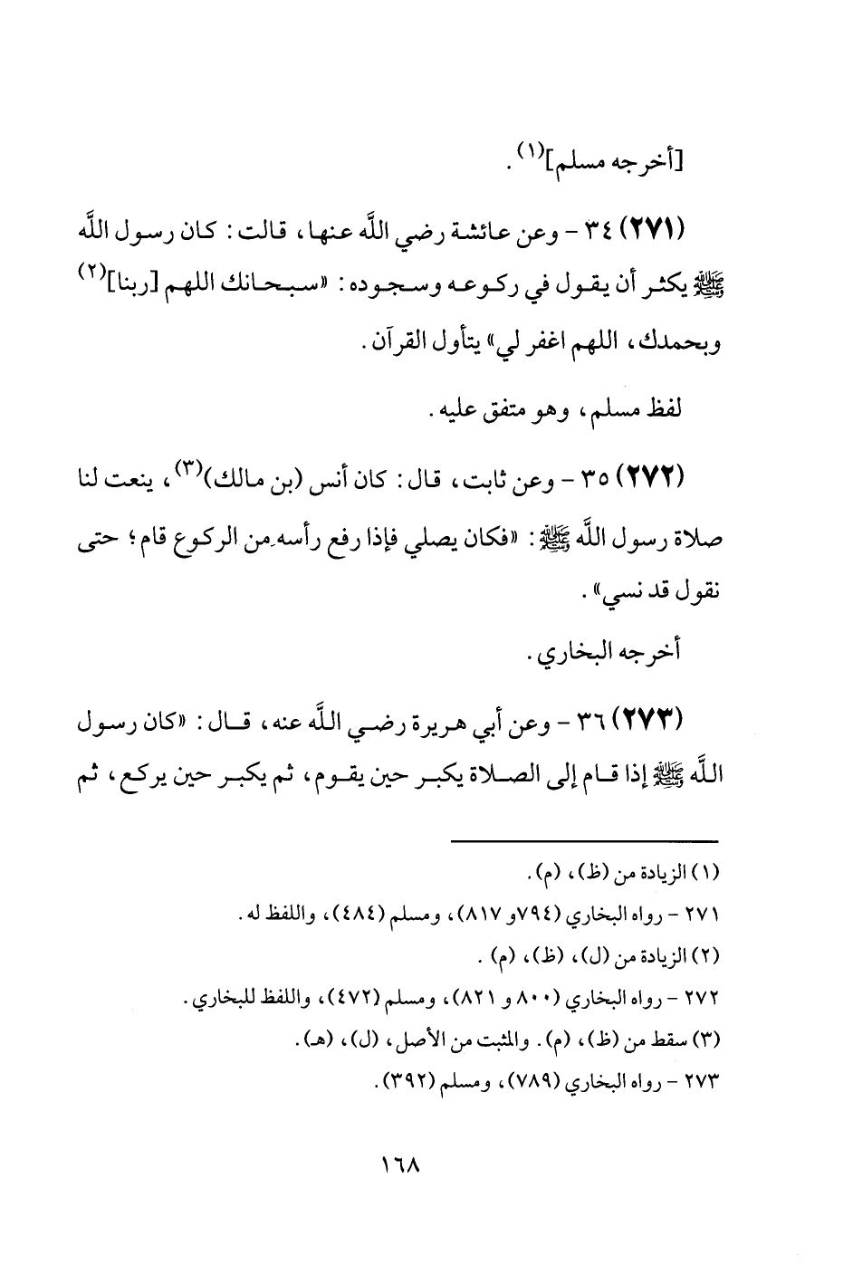 (271) وَعَن عَائِشَة رَضِيَ اللَّهُ عَنْها، قَالَت: كَانَ رَسُول الله [صَلَّى اللَّهُ عَلَيْهِ وَسَلَّم َ] يكثر أَن يَقُول فِي رُكُوعه وَسُجُوده: " سُبْحَانَكَ اللَّهُمَّ [رَبنَا] وَبِحَمْدِك، اللَّهُمَّ اغْفِر لي " يتَأَوَّل الْقُرْآن. لفظ مُسلم، وَهُوَ مُتَّفق عَلَيْهِ.