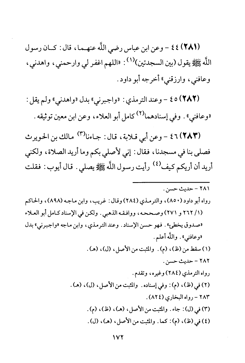 (282) وَعند التِّرْمِذِيّ: " واجبرني " بدل " واهدني " وَلم يقل: " وَعَافنِي ". وَفِي إسنادهما كَامِل أَبُو الْعَلَاء، وَعَن ابْن معِين توثيقه.