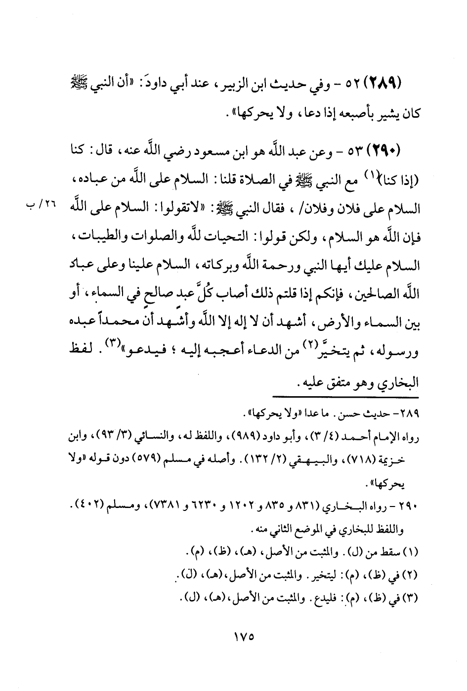 (290) وَعَن عبد الله هُوَ ابْن مَسْعُود رَضِيَ اللَّهُ عَنْه، قَالَ: كُنَّا (إِذا كُنَّا) مَعَ النَّبِي [صَلَّى اللَّهُ عَلَيْهِ وَسَلَّم َ] فِي الصَّلَاة قُلْنَا: السَّلَام عَلَى الله من عباده، السَّلَام عَلَى فلَان وَفُلَان /، فَقَالَ النَّبِي [صَلَّى اللَّهُ عَلَيْهِ وَسَلَّم َ] : " لَا تَقولُوا: السَّلَام عَلَى الله فَإِن الله هُوَ السَّلَام، وَلَكِن قُولُوا: التَّحِيَّات لله والصلوات والطيبات، السَّلَام عَلَيْك أَيهَا النَّبِي وَرَحْمَة الله وَبَرَكَاته، السَّلَام علينا وَعَلَى عباد الله الصَّالِحين، فَإِنَّكُم إِذا قُلْتُمْ ذَلِك أصَاب كُلَّ عبدٍ صالحٍ فِي السَّمَاء، أَو بَين السَّمَاء وَالْأَرْض، أشهد أَن لَا إِلَه إِلَّا الله وَأشْهد أَن مُحَمَّدًا عَبده وَرَسُوله، ثمَّ يتخيَّر من الدُّعَاء أعجبه إِلَيْهِ؛ فيدعو ". لفظ البُخَارِيّ وَهُوَ مُتَّفق عَلَيْهِ.