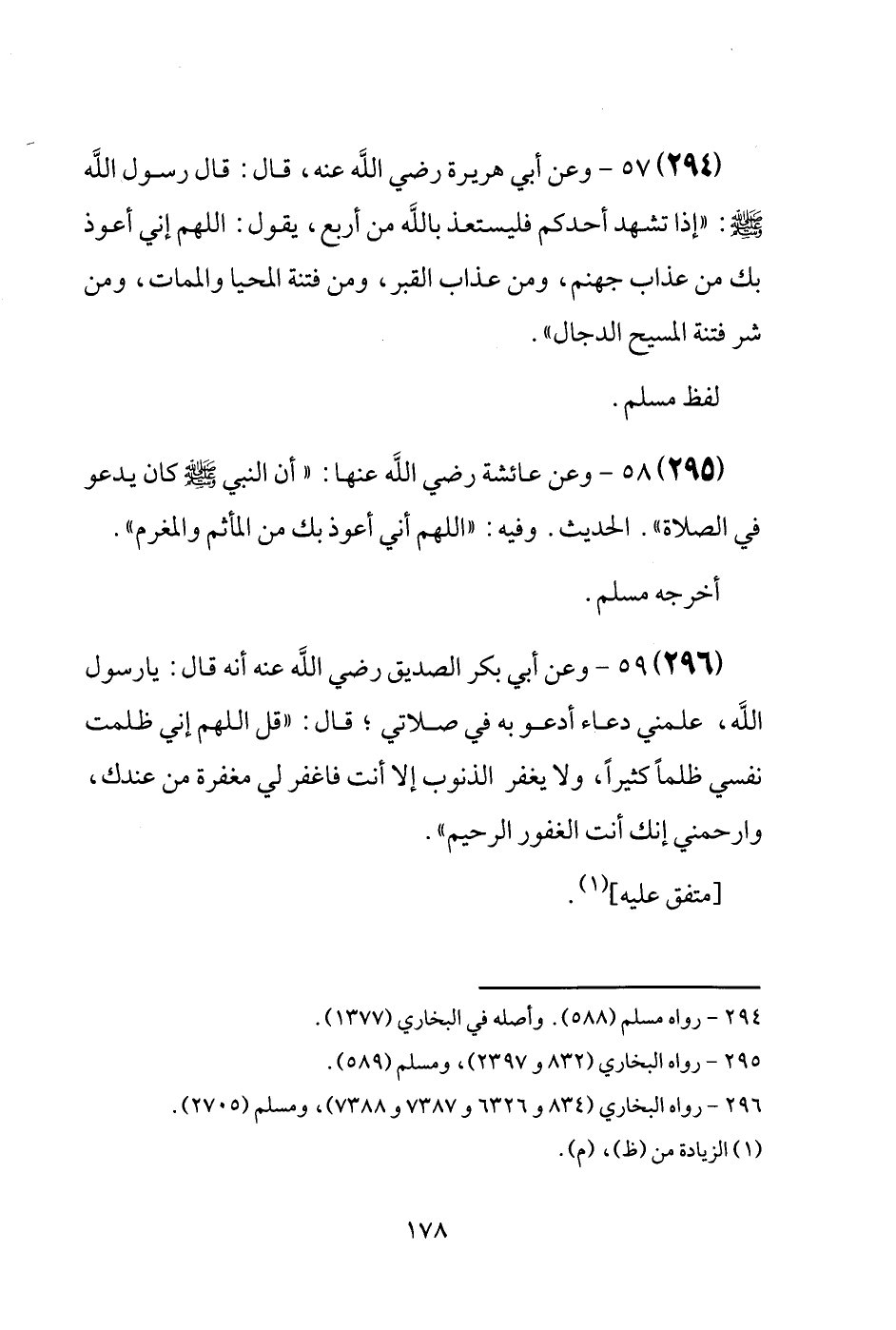 (294) وَعَن أبي هُرَيْرَة رَضِيَ اللَّهُ عَنْه، قَالَ: قَالَ رَسُول الله [صَلَّى اللَّهُ عَلَيْهِ وَسَلَّم َ] : " إِذا تشهد أحدكُم فليستعذ بِاللَّه من أَربع، يَقُول: اللَّهُمَّ إِنِّي أعوذ بك من عَذَاب جَهَنَّم، وَمن عَذَاب الْقَبْر، وَمن فتْنَة الْمحيا وَالْمَمَات، وَمن شَرّ فتْنَة الْمَسِيح الدَّجَّال ". لفظ مُسلم.