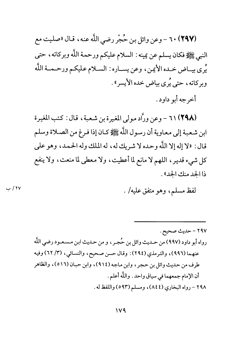 (298) وَعَن ورَّاد مولَى الْمُغيرَة بن شُعْبَة، قَالَ: كتب الْمُغيرَة بن شُعْبَة إِلَى مُعَاوِيَة أَن رَسُول الله [صَلَّى اللَّهُ عَلَيْهِ وَسَلَّم َ] كَانَ إِذا فرغ من الصَّلَاة وَسلم قَالَ: " لَا إِلَه إِلَّا الله وَحده لَا شريك لَهُ، لَهُ الْملك وَله الْحَمد، وَهُوَ عَلَى كل شَيْء قدير، اللَّهُمَّ لَا مَانع لما أَعْطَيْت، وَلَا معطي لما منعت، وَلَا ينفع ذَا الْجد مِنْك الْجد ". لفظ مُسلم، وَهُوَ مُتَّفق عَلَيْهِ /.