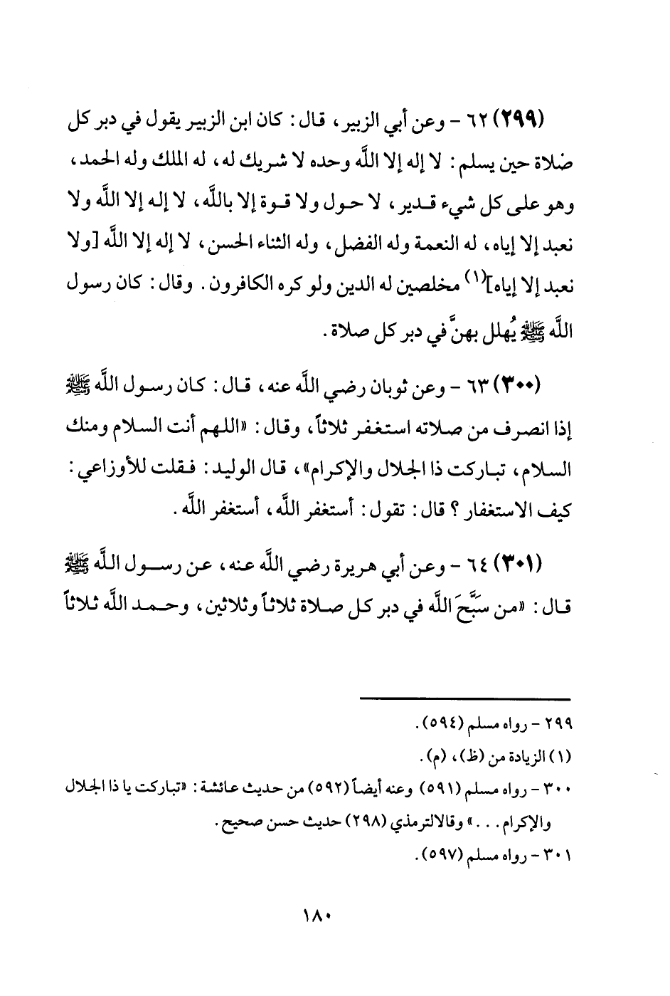 (299) وَعَن أبي الزبير، قَالَ: كَانَ ابْن الزبير يَقُول فِي دبر كل صَلَاة حِين يسلم: لَا إِلَه إِلَّا الله وَحده لَا شريك لَهُ، لَهُ الْملك وَله الْحَمد، وَهُوَ عَلَى كل شَيْء قدير، لَا حول وَلَا قُوَّة إِلَّا بِاللَّه، لَا إِلَه إِلَّا الله وَلَا نعْبد إِلَّا إِيَّاه، لَهُ النِّعْمَة وَله الْفضل، وَله الثَّنَاء الْحسن، لَا إِلَه إِلَّا الله [وَلَا نعْبد إِلَّا إِيَّاه] مُخلصين لَهُ الدَّين وَلَو كره الْكَافِرُونَ. وَقَالَ: كَانَ رَسُول الله [صَلَّى اللَّهُ عَلَيْهِ وَسَلَّم َ] يُهلل بهنَّ فِي دبر كل صَلَاة.