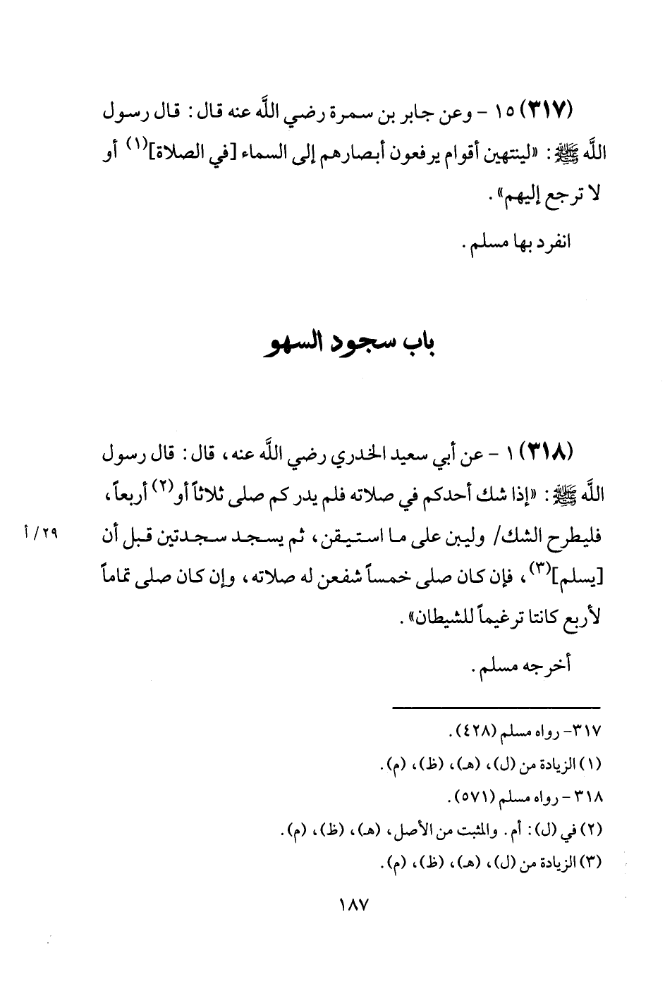 (317) وَعَن جَابر بن سَمُرَة رَضِيَ اللَّهُ عَنْه قَالَ: قَالَ رَسُول الله [صَلَّى اللَّهُ عَلَيْهِ وَسَلَّم َ] : " لينتهين أَقوام يرفعون أَبْصَارهم إِلَى السَّمَاء [فِي الصَّلَاة] أَو لَا ترجع إِلَيْهِم ". انْفَرد بهَا مُسلم.