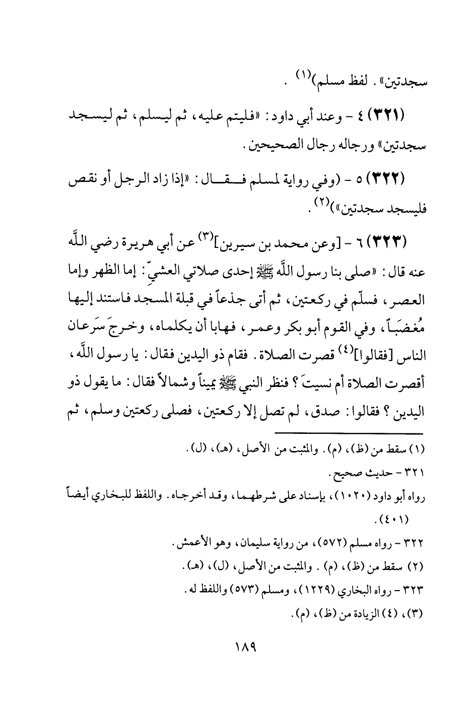 (323) [وَعَن مُحَمَّد بن سِيرِين] عَن أبي هُرَيْرَة رَضِيَ اللَّهُ عَنْه قَالَ: " صَلَّى بِنَا رَسُول الله [صَلَّى اللَّهُ عَلَيْهِ وَسَلَّم َ] إِحْدَى صَلَاتي العشيِّ: إِمَّا الظّهْر وَإِمَّا الْعَصْر، فسلّم فِي رَكْعَتَيْنِ، ثمَّ أَتَى جذعاً فِي قبْلَة الْمَسْجِد فاستند إِلَيْهَا مُغضَباً، وَفِي الْقَوْم أَبُو بكر وَعمر، فَهَابَا أَن يُكَلِّمَاهُ، وخرجَ سَرعان النَّاس [فَقَالُوا] قصرت الصَّلَاة. فَقَامَ ذُو الْيَدَيْنِ فَقَالَ: يَا رَسُول الله، أقصرت الصَّلَاة أم نسيتَ؟ فَنظر النَّبِي [صَلَّى اللَّهُ عَلَيْهِ وَسَلَّم َ] يَمِينا وَشمَالًا فَقَالَ: مَا يَقُول ذُو الْيَدَيْنِ؟ فَقَالُوا: صدق، لم تصل إِلَّا رَكْعَتَيْنِ، فَصَلى رَكْعَتَيْنِ وَسلم، ثمَّ