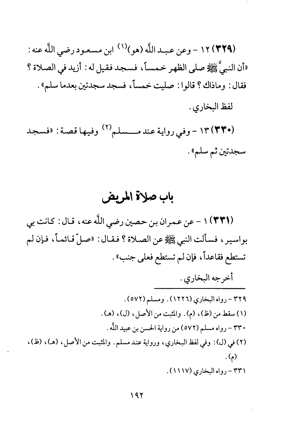 (329) وَعَن عبد الله (هُوَ) ابْن مَسْعُود رَضِيَ اللَّهُ عَنْه: " أَن النَّبِي [صَلَّى اللَّهُ عَلَيْهِ وَسَلَّم َ] صَلَّى الظّهْر خمْسا، فَسجدَ فَقيل لَهُ: أَزِيد فِي الصَّلَاة؟ فَقَالَ: وَمَا ذَاك؟ قَالُوا: صليت خمْسا، فَسجدَ سَجْدَتَيْنِ بَعْدَمَا سلم ". لفظ البُخَارِيّ.