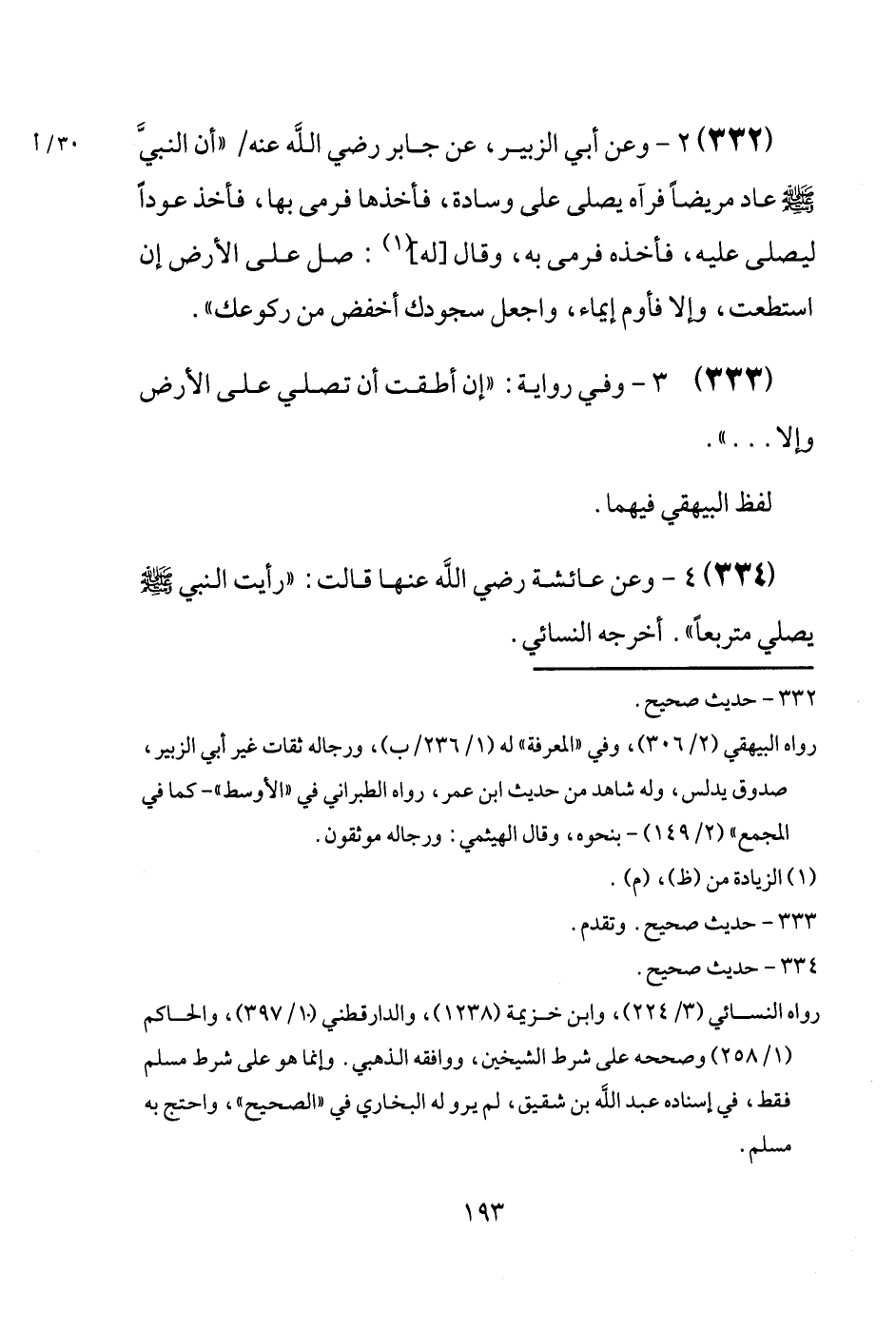 (332) وَعَن أبي الزبير، عَن جَابر رَضِيَ اللَّهُ عَنْه / " أَن النبيَّ [صَلَّى اللَّهُ عَلَيْهِ وَسَلَّم َ] عَاد مَرِيضا فَرَآهُ يُصَلِّي عَلَى وسَادَة، فَأَخذهَا فَرَمَى بهَا، فَأخذ عوداً ليُصَلِّي عَلَيْهِ، فَأَخذه فَرَمَى بِهِ، وَقَالَ [لَهُ] : صل عَلَى الأَرْض إِن اسْتَطَعْت، وَإِلَّا فأوم إِيمَاء، وَاجعَل سجودك أَخفض من ركوعك ".