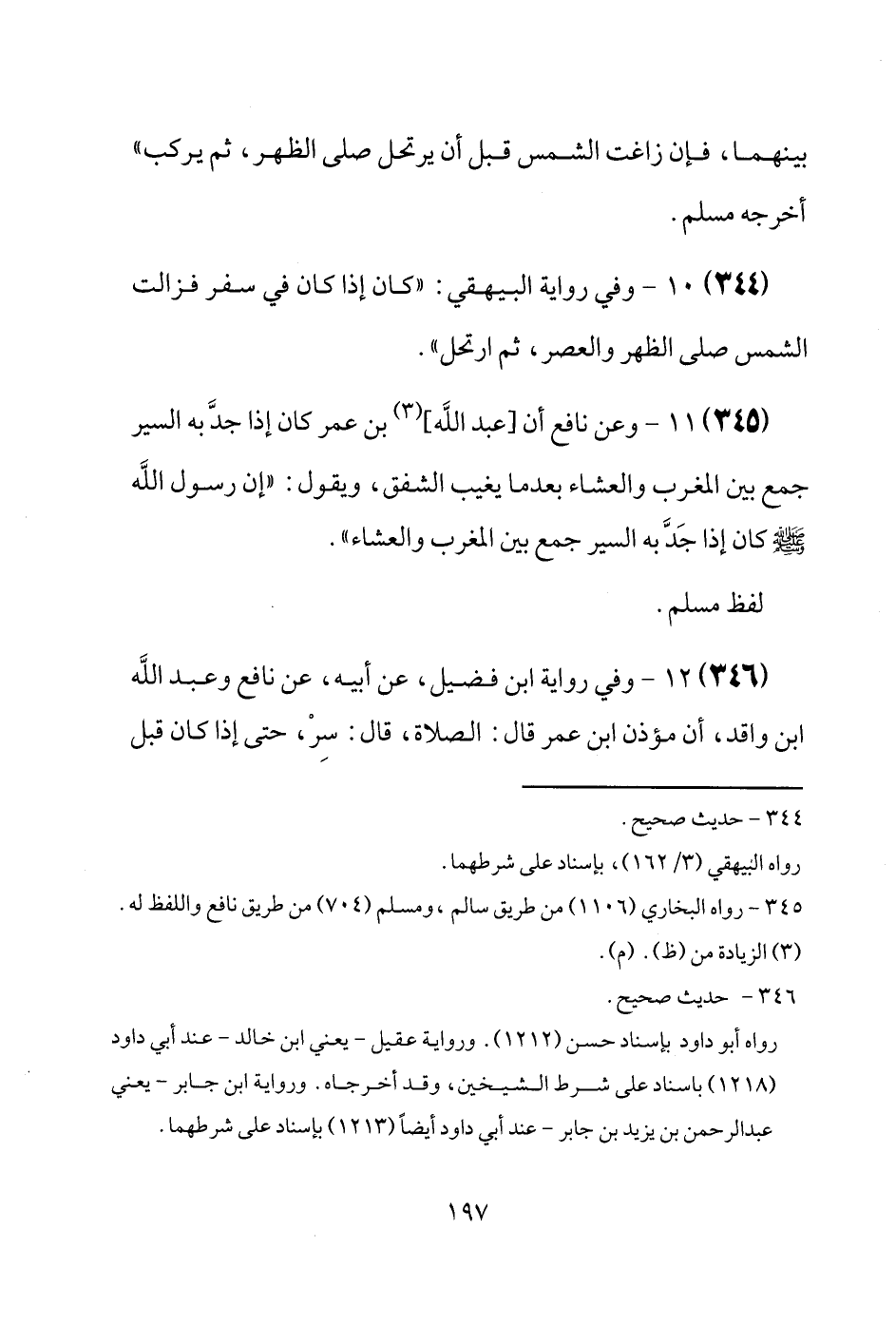 (345) وَعَن نَافِع أَن [عبد الله] بن عمر كَانَ إِذا جدَّ بِهِ السّير جمع بَين الْمغرب وَالْعشَاء بَعْدَمَا يغيب الشَّفق، وَيَقُول: " إِن رَسُول الله [صَلَّى اللَّهُ عَلَيْهِ وَسَلَّم َ] كَانَ إِذا جَدَّ بِهِ السّير جمع بَين الْمغرب وَالْعشَاء ". لفظ مُسلم.