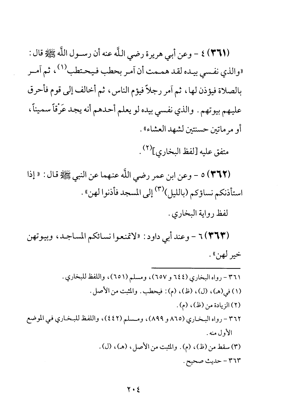 (361) وَعَن أبي هُرَيْرَة رَضِيَ اللَّهُ عَنْه أَن رَسُول الله [صَلَّى اللَّهُ عَلَيْهِ وَسَلَّم َ] قَالَ: " وَالَّذِي نَفسِي بِيَدِهِ لقد هَمَمْت أَن آمُر بحطب فيحتطب، ثمَّ آمُر بِالصَّلَاةِ فَيُؤذن لَهَا، ثمَّ آمُر رجلا فيؤم النَّاس، ثمَّ أُخَالِف إِلَى قوم فَأحرق عَلَيْهِم بُيُوتهم. وَالَّذِي نَفسِي بِيَدِهِ لَو يعلم أحدهم أَنه يجد عَرْقاً سميناً، أَو مرماتين حسنتين لشهد الْعشَاء " مُتَّفق عَلَيْهِ [لفظ البُخَارِيّ] .