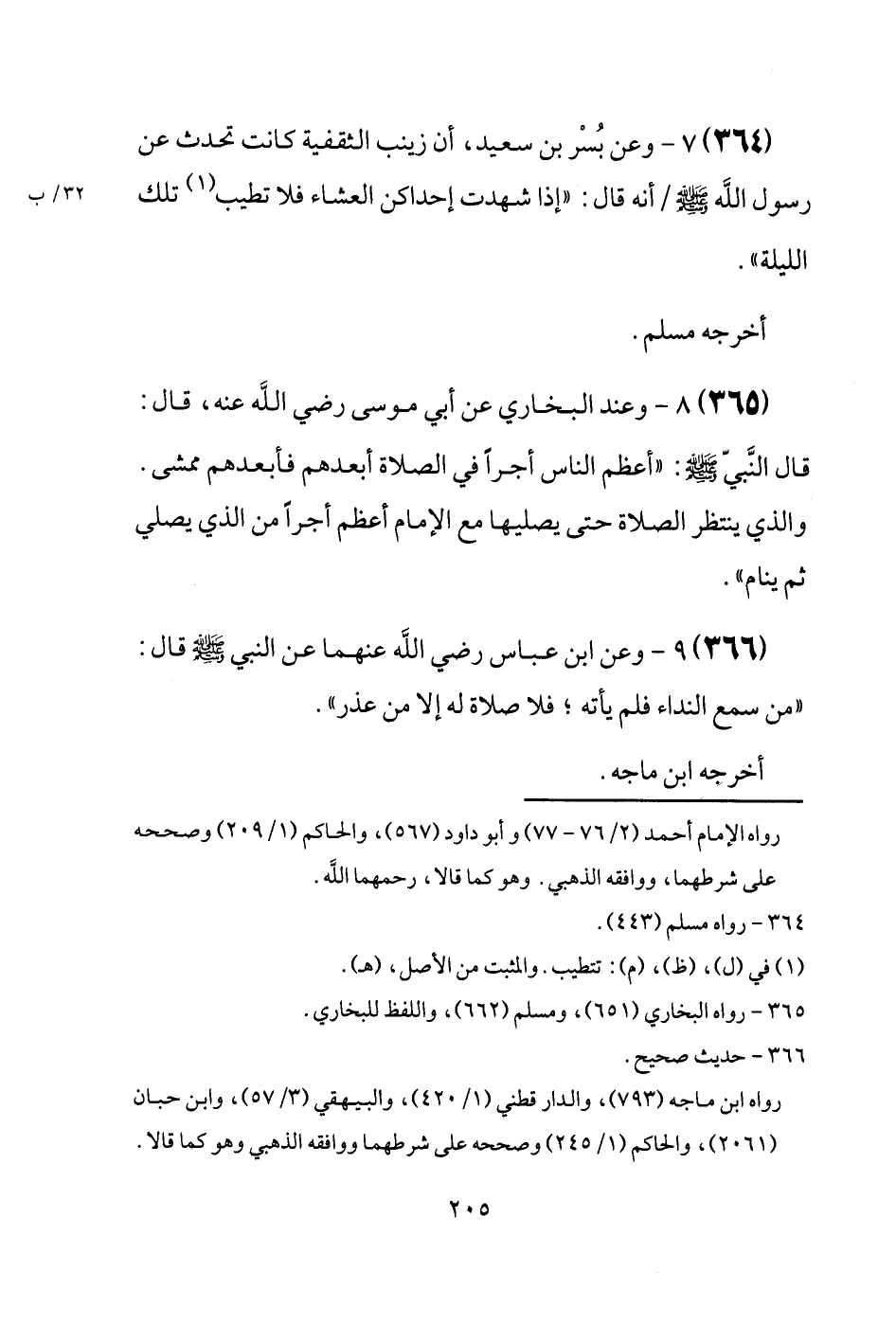 (364) وَعَن بُسْر بن سعيد، أَن زَيْنَب الثقفية كَانَت تحدث عَن رَسُول الله [صَلَّى اللَّهُ عَلَيْهِ وَسَلَّم َ] / أَنه قَالَ: " إِذا شهِدت إحداكن الْعشَاء فَلَا تطيب تِلْكَ اللَّيْلَة ". أخرجه مُسلم.