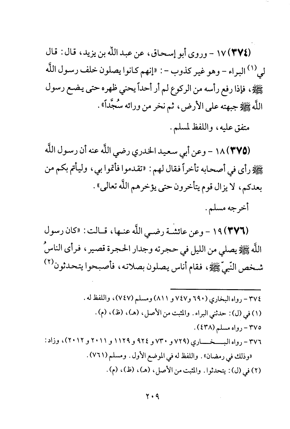 (374) وَرَوَى أَبُو إِسْحَاق، عَن عبد الله بن يزِيد، قَالَ: قَالَ لي الْبَراء - وَهُوَ غير كذوب -: " إِنَّهُم كَانُوا يصلونَ خلف رَسُول الله [صَلَّى اللَّهُ عَلَيْهِ وَسَلَّم َ] ، فَإِذا رفع رَأسه من الرُّكُوع لم أر أحدا يحني ظَهره حَتَّى يضع رَسُول الله [صَلَّى اللَّهُ عَلَيْهِ وَسَلَّم َ] جَبهته عَلَى الأَرْض، ثمَّ نخر من وَرَائه سُجَّداً ". مُتَّفق عَلَيْهِ، وَاللَّفْظ لمُسلم.