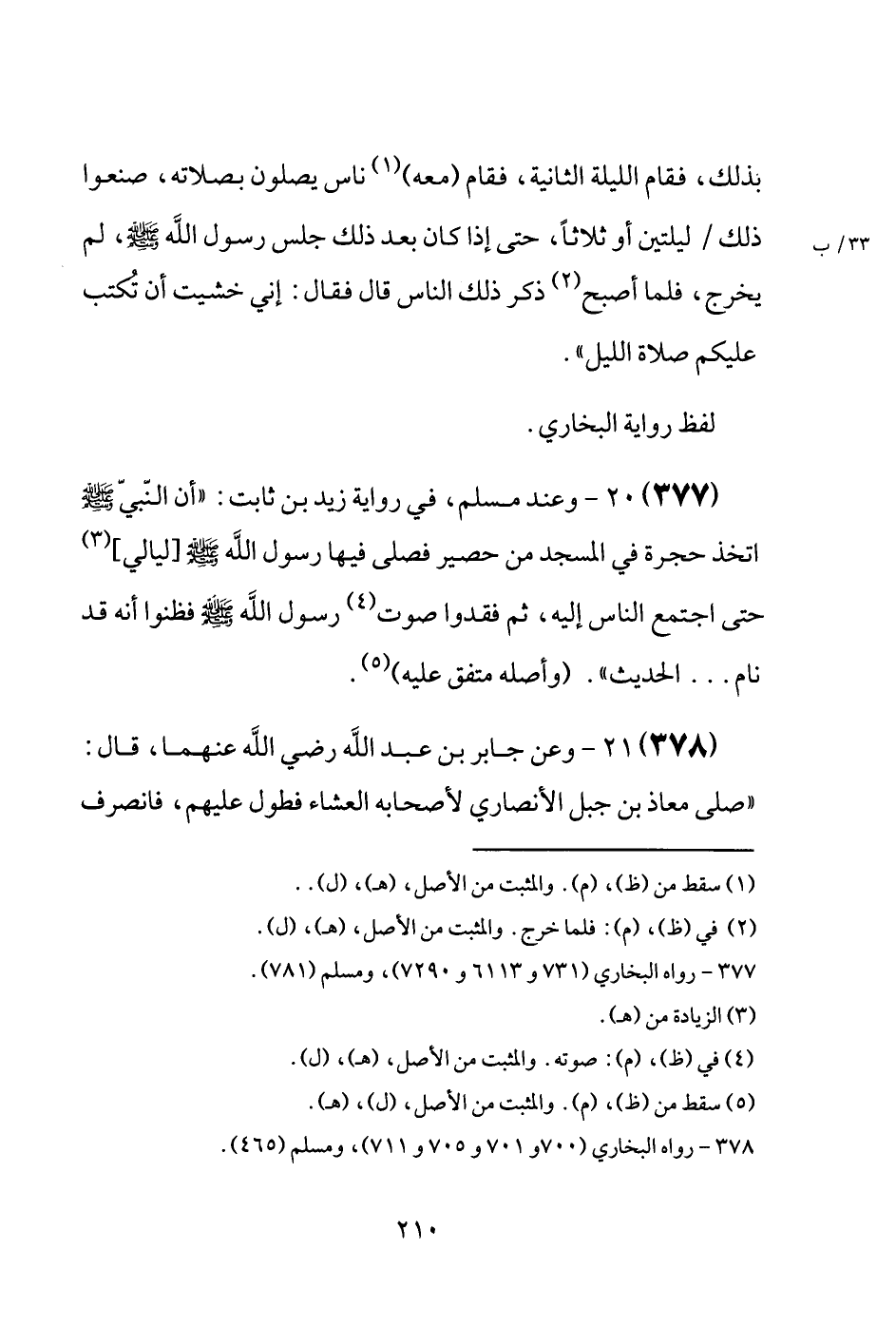 (377) وَعند مُسلم، فِي رِوَايَة زيد بن ثَابت: " أَن النّبيّ [صَلَّى اللَّهُ عَلَيْهِ وَسَلَّم َ] اتخذ حجرَة فِي الْمَسْجِد من حَصِير فَصَلى فِيهَا رَسُول الله [صَلَّى اللَّهُ عَلَيْهِ وَسَلَّم َ] [ليَالِي] حَتَّى اجْتمع النَّاس إِلَيْهِ، ثمَّ فقدوا صَوت رَسُول الله [صَلَّى اللَّهُ عَلَيْهِ وَسَلَّم َ] فظنوا أَنه قد نَام ... الحَدِيث ". (وَأَصله مُتَّفق عَلَيْهِ) .