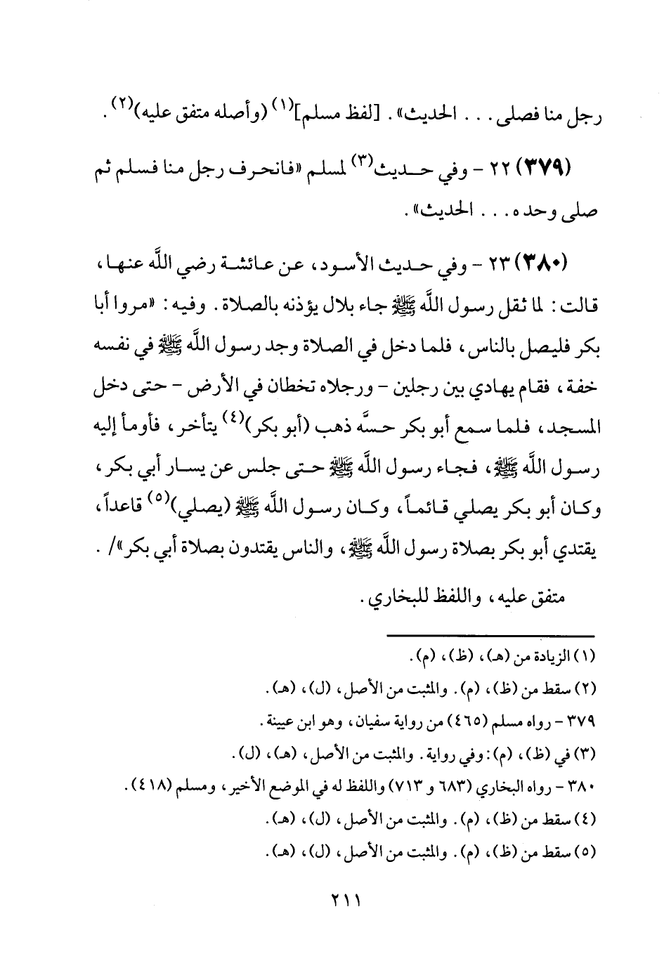 (380) وَفِي حَدِيث الْأسود، عَن عَائِشَة رَضِيَ اللَّهُ عَنْها، قَالَت: لما ثقل رَسُول الله [صَلَّى اللَّهُ عَلَيْهِ وَسَلَّم َ] جَاءَ بِلَال يُؤذنهُ بِالصَّلَاةِ. وَفِيه: " مروا أَبَا بكر فَليصل بِالنَّاسِ، فَلَمَّا دخل فِي الصَّلَاة وجد رَسُول الله [صَلَّى اللَّهُ عَلَيْهِ وَسَلَّم َ] فِي نَفسه خفَّة، فَقَامَ يهادي بَين رجلَيْنِ - وَرجلَاهُ تخطان فِي الأَرْض - حَتَّى دخل الْمَسْجِد، فَلَمَّا سمع أَبُو بكر حسَّه ذهب (أَبُو بكر) يتَأَخَّر، فَأَوْمأ إِلَيْهِ رَسُول الله [صَلَّى اللَّهُ عَلَيْهِ وَسَلَّم َ] ، فجَاء رَسُول الله [صَلَّى اللَّهُ عَلَيْهِ وَسَلَّم َ] حَتَّى جلس عَن يسَار أبي بكر، وَكَانَ أَبُو بكر يُصَلِّي قَائِما، وَكَانَ رَسُول الله [صَلَّى اللَّهُ عَلَيْهِ وَسَلَّم َ] (يُصَلِّي) قَاعِدا، يَقْتَدِي أَبُو بكر بِصَلَاة رَسُول الله [صَلَّى اللَّهُ عَلَيْهِ وَسَلَّم َ] ، وَالنَّاس يقتدون بِصَلَاة أبي بكر " /. مُتَّفق عَلَيْهِ، وَاللَّفْظ للْبُخَارِيّ.