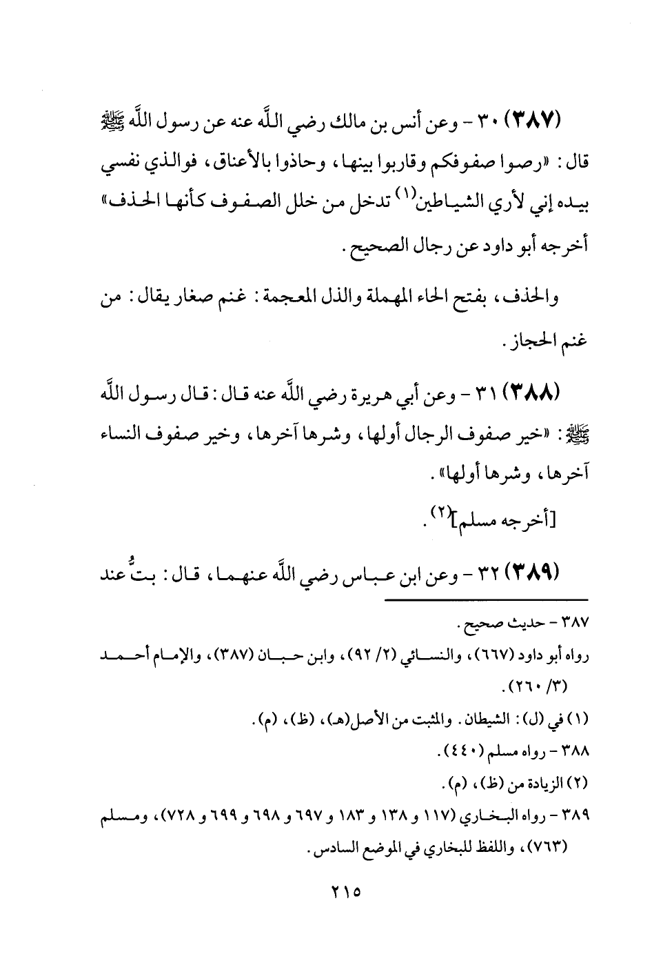 (387) وَعَن أنس بن مَالك رَضِيَ اللَّهُ عَنْه عَن رَسُول الله [صَلَّى اللَّهُ عَلَيْهِ وَسَلَّم َ] قَالَ: " رصوا صفوفكم وقاربوا بَينهَا، وحاذوا بالأعناق، فوالذي نَفسِي بِيَدِهِ إِنِّي لأرَى الشَّيَاطِين تدخل من خلل الصُّفُوف كَأَنَّهَا الْحَذف " أخرجه أَبُو دَاوُد عَن رجال الصَّحِيح. والحذف، بِفَتْح الْحَاء الْمُهْملَة والذال الْمُعْجَمَة: غنم صغَار يُقَال: من غنم الْحجاز.