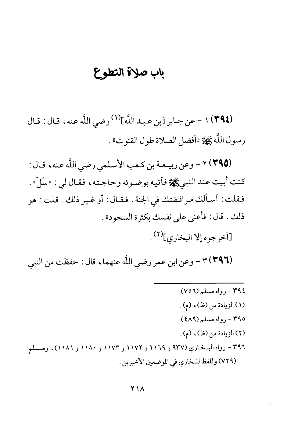 (395) وَعَن ربيعَة بن كَعْب الْأَسْلَمِيّ رَضِيَ اللَّهُ عَنْه، قَالَ: كنت أَبيت عِنْد النَّبِي [صَلَّى اللَّهُ عَلَيْهِ وَسَلَّم َ] فآتيه بوضوئه وَحَاجته، فَقَالَ لي: " سَلْ ". فَقلت: أَسأَلك مرافقتك فِي الْجنَّة. فَقَالَ: أَو غير ذَلِك. قلت: هُوَ ذَلِك. قَالَ: فأعني عَلَى نَفسك بِكَثْرَة السُّجُود ". [أَخْرجُوهُ إِلَّا البُخَارِيّ] .