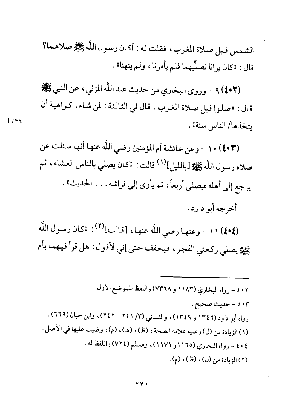(402) وَرَوَى البُخَارِيّ من حَدِيث عبد الله الْمُزنِيّ، عَن النَّبِي [صَلَّى اللَّهُ عَلَيْهِ وَسَلَّم َ] قَالَ: " صلوا قبل صَلَاة الْمغرب. قَالَ فِي الثَّالِثَة: لمن شَاءَ، كَرَاهِيَة أَن يتخذها / النَّاس سنة ".