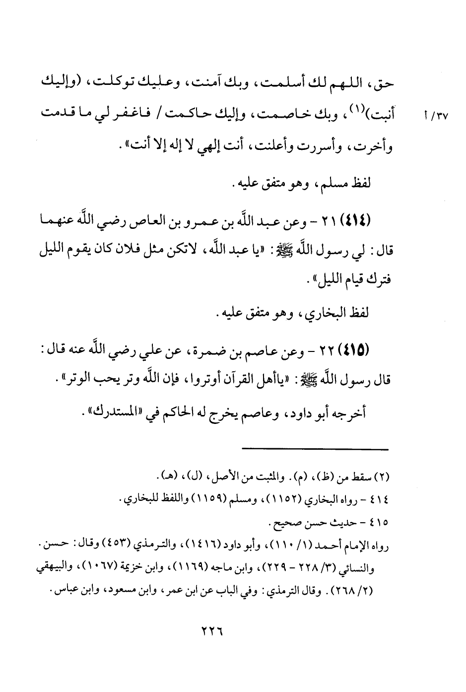 (414) وَعَن عبد الله بن عَمْرو بن الْعَاصِ رَضِيَ اللَّهُ عَنْهما قَالَ: قَالَ لي رَسُول الله [صَلَّى اللَّهُ عَلَيْهِ وَسَلَّم َ] : " يَا عبد الله، لَا تكن مثل فلَان كَانَ يقوم اللَّيْل فَترك قيام اللَّيْل ". لفظ البُخَارِيّ، وَهُوَ مُتَّفق عَلَيْهِ.