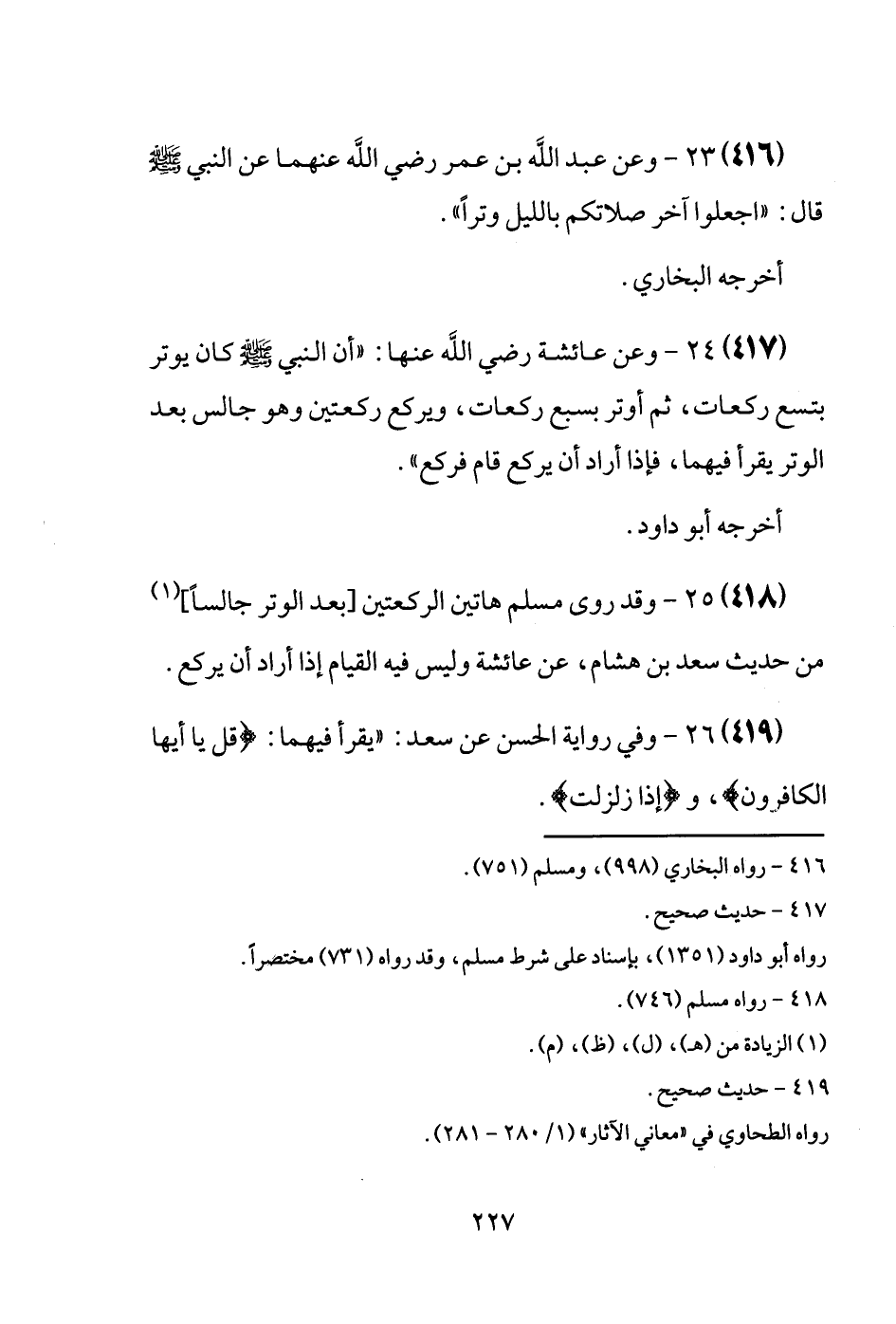 (416) وَعَن عبد الله بن عمر رَضِيَ اللَّهُ عَنْهما عَن النَّبِي [صَلَّى اللَّهُ عَلَيْهِ وَسَلَّم َ] قَالَ: " اجعلوا آخر صَلَاتكُمْ بِاللَّيْلِ وترا ". أخرجه البُخَارِيّ.